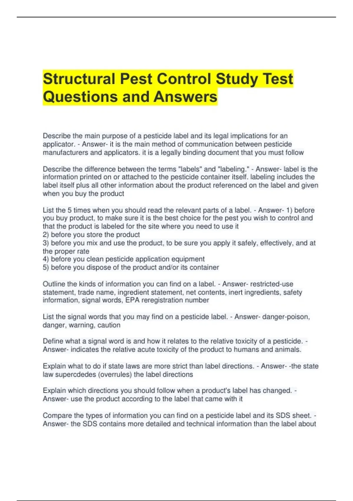 Structural Pest Control Study Test Questions and Answers