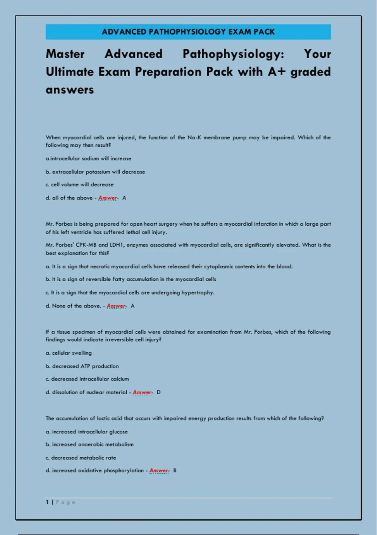 This Advanced Pathophysiology Exam Pack brings together high-level, exam-focused questions crafted to sharpen your critical thinking and deepen your understanding of complex disease processes. Each item is designed to mirror real assessment standards—pushing you to apply mechanisms, integrate concepts, and reason like a clinician. Whether you’re preparing for a major test or tightening your grasp on challenging topics, this pack gives you an edge where it matters most. Take the step now—equip yourself with a resource built to elevate your performance and walk into your exam with confidence