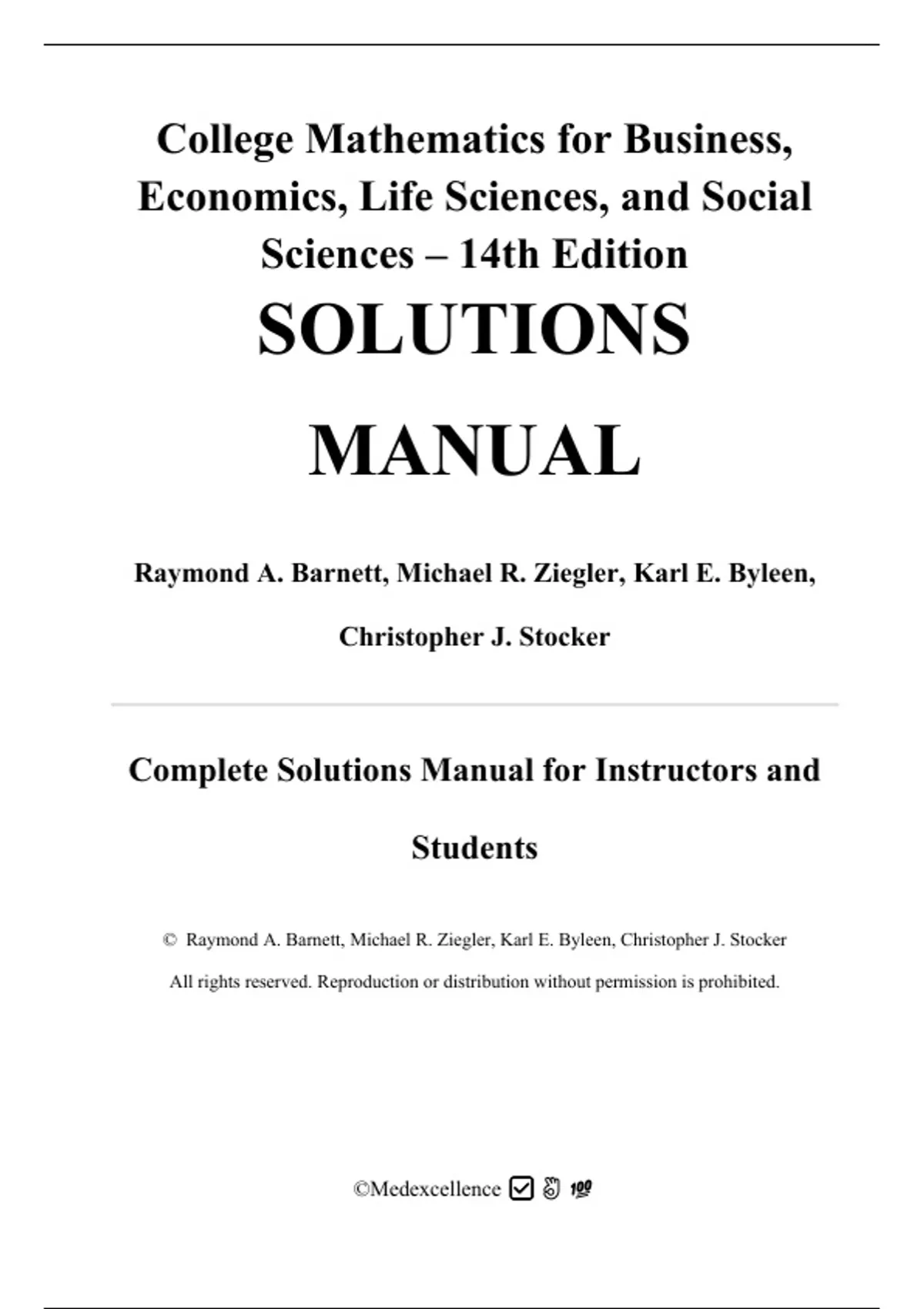The Solutions for College Mathematics for Business, Economics, Life Sciences, and Social Sciences, 14th Edition (ISBN 9780134674148) by Raymond A. Barnett, Michael R. Ziegler, Karl E. Byleen, and Christopher J. Stocker provide complete, step-by-step answers to all problems in the textbook. Each solution is fully worked out to ensure clarity, accuracy, and consistency, making it an essential companion for students and instructors working through applied mathematics topics. The content follows the official textbook organization. It begins with Part I: A Library of Elementary Functions, including Chapter 1: Linear Equations and Graphs and Chapter 2: Functions and Graphs. Part II: Finite Mathematics covers Chapter 3: Mathematics of Finance, Chapter 4: Systems of Linear Equations; Matrices, Chapter 5: Linear Inequalities and Linear Programming, Chapter 6: Linear Programming: The Simplex Method, Chapter 7: Logic, Sets, and Counting, and Chapter 8: Probability. Part III: Calculus proceeds with Chapter 9: Limits and the Derivative, Chapter 10: Additional Derivative Topics, Chapter 11: Graphing and Optimization, Chapter 12: Integration, Chapter 13: Additional Integration Topics, Chapter 14: Multivariable Calculus, and Chapter 15: Markov Chains.