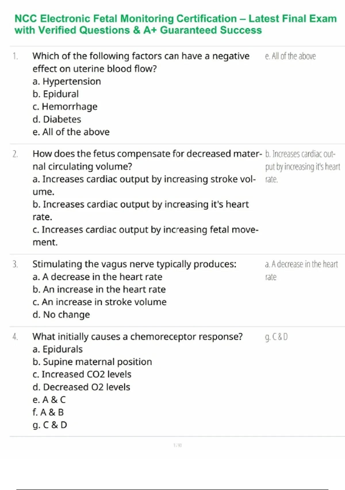 Ace your NCC Electronic Fetal Monitoring (EFM) Certification Exam with this updated and verified final exam study guide. It includes realistic questions, correct answers, and in-depth rationales covering fetal heart rate interpretation, maternal-fetal physiology, monitoring techniques, and safety protocols. Designed for nurses and perinatal professionals, this comprehensive review mirrors the latest NCC exam format (2025 edition). With expert-verified content, it’s the ultimate tool for mastering EFM concepts, boosting confidence, and achieving A+ guaranteed certification success.