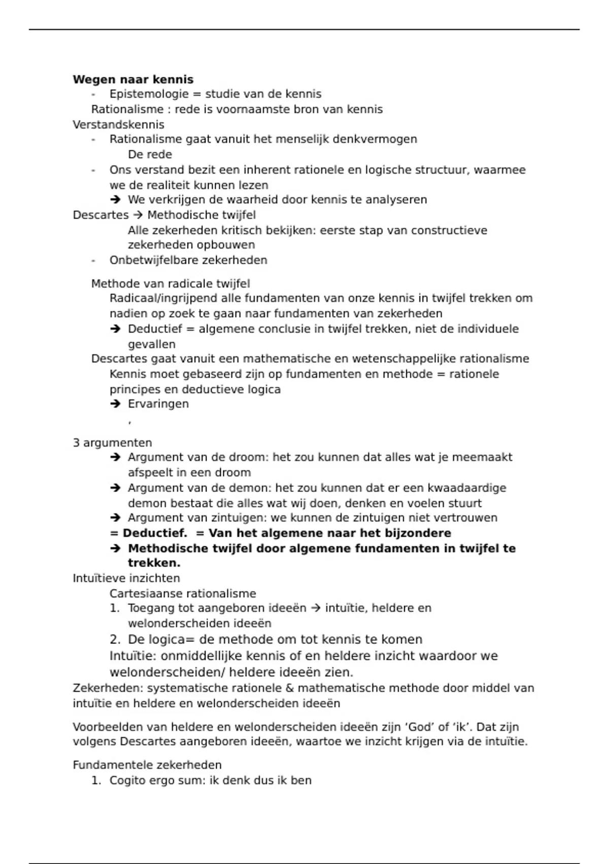 Deze samenvatting biedt een volledig en helder overzicht van de wegen naar kennis binnen de epistemologie. Het document behandelt de drie grote kennisstromingen: rationalisme, empirisme en Kants transcendentaal idealisme. Je krijgt een overzicht van Descartes’ methodische twijfel, intuïtieve inzichten, aangeboren ideeën en de fundamentele zekerheden zoals cogito ergo sum. Daarnaast worden Locke, Berkeley en Hume uitgebreid besproken, met focus op zintuiglijke ervaring, complexe ideeën, primaire en secundaire kwaliteiten, scepticisme en het inductieprobleem. Tot slot wordt Kant’s Copernicaanse omwenteling uitgelegd, inclusief zijn onderscheid tussen analytische/synthetische oordelen, a priori structuren (tijd, ruimte, causaliteit) en het verschil tussen de fenomenale en noumenale wereld. Ideaal voor studenten die snel en duidelijk inzicht willen krijgen in de belangrijkste filosofische theorieën over kennisverwerving.