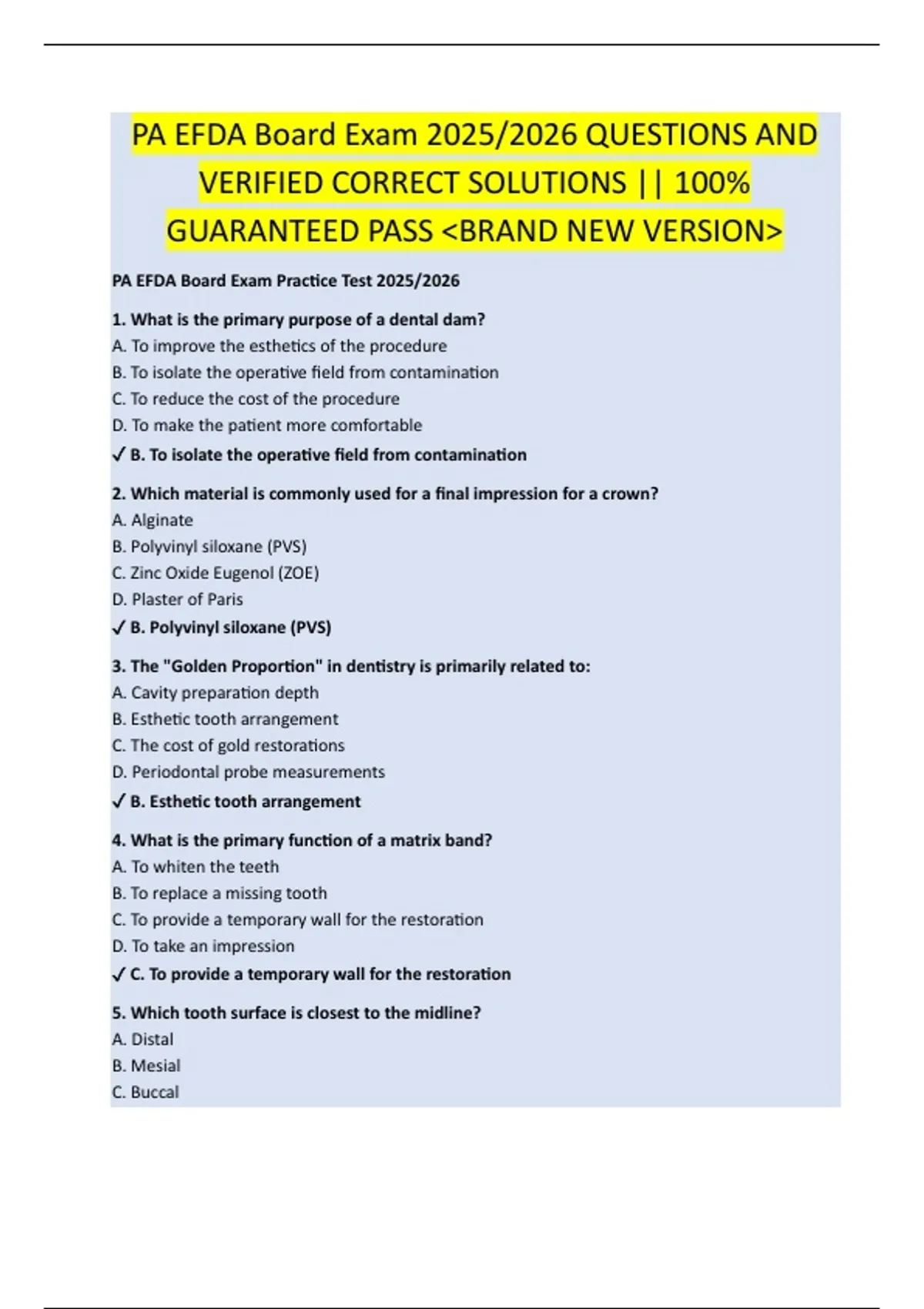 PA EFDA Board Exam 2025/2026 QUESTIONS AND VERIFIED CORRECT SOLUTIONS || 100% GUARANTEED PASS &lt;BRAND NEW VERSION&gt;