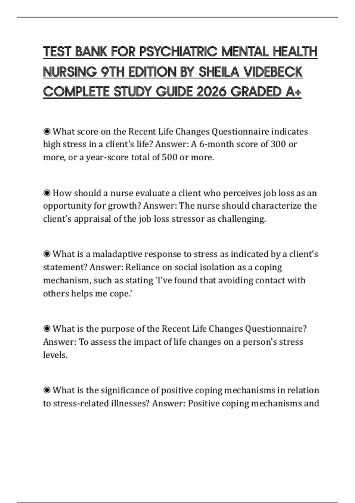 TEST BANK FOR PSYCHIATRIC MENTAL HEALTH NURSING 9TH EDITION BY SHEILA VIDEBECK COMPLETE STUDY GUIDE 2026 GRADED A+