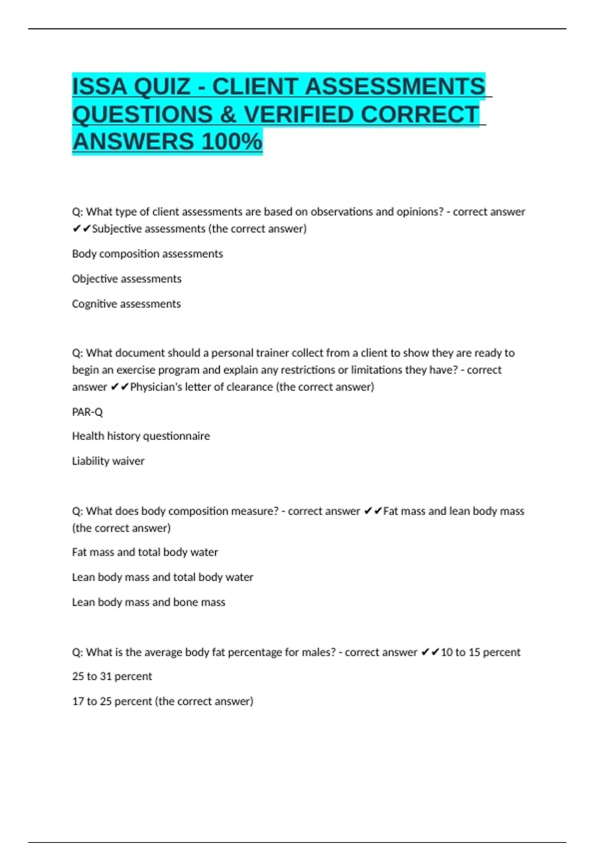 ISSA QUIZ - CLIENT ASSESSMENTS QUESTIONS & VERIFIED CORRECT ANSWERS 100% flagship program offered by the International Sports Sciences Association. It’s designed to prepare learners to become professional fitness trainers with a strong foundation in exercise science, coaching, and program design.