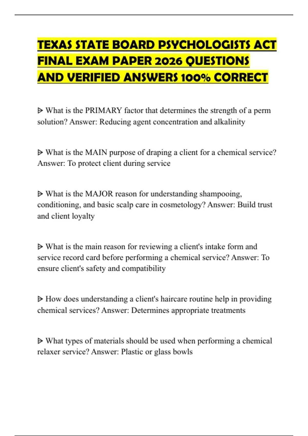 TEXAS STATE BOARD PSYCHOLOGISTS ACT FINAL EXAM PAPER 2026 QUESTIONS AND VERIFIED ANSWERS 100% CORRECT