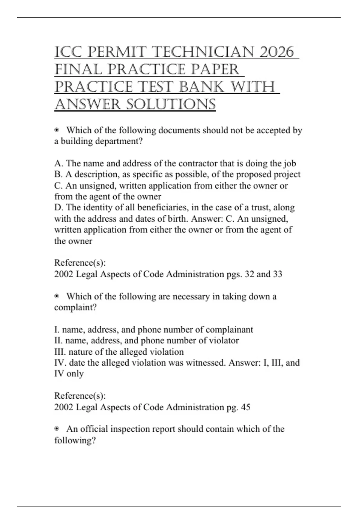 ICC PERMIT TECHNICIAN2026FINAL PRACTICE PAPERPRACTICE TESTBANKWITHANSWER SOLUTIONS