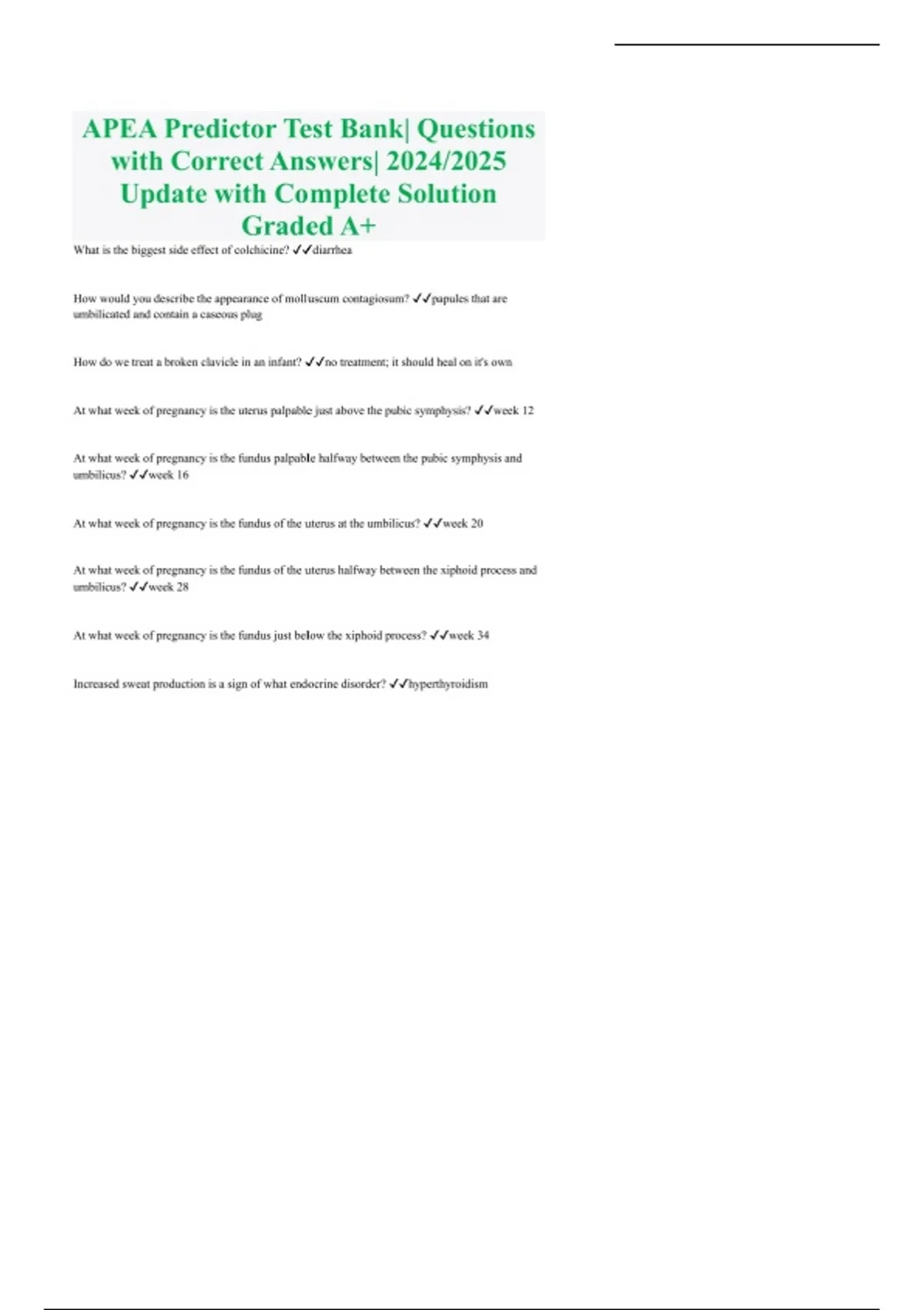 Prepare smarter, score higher, and approach your APEA Predictor Exam with total confidence using the APEA Predictor Exam Question Bank, one of the most trusted and best-selling NP predictor review resources available. This professionally curated question bank provides verified, high-quality predictor questions and accurate, fully explained solutions, giving nurse practitioner students a powerful advantage during exam preparation. Perfect for FNP, AGNP, ACNP, PACNP, and other advanced practice nursing programs, this question bank mirrors the style, structure, and difficulty of the official APEA Predictor Exam. Whether you are preparing early in the semester or doing a last-minute review, this resource delivers everything you need to strengthen clinical reasoning, improve accuracy, and build exam-day confidence. What This APEA Predictor Exam Question Bank Includes Verified, Exam-Level Predictor Questions Every question has been carefully reviewed and validated for relevance, accuracy, and alignment with APEA exam standards. You won’t find outdated or low-quality items—only professionally crafted, high-yield questions that truly reflect the real predictor exam. Complete Solutions & Correct Answers The question bank includes the precise correct answers and detailed explanations to help you understand the reasoning behind each answer choice. This strengthens comprehension, supports long-term memory, and allows you to learn actively rather than guess your way through practice tests. Covers All Core APEA 3P Content Domains This predictor question bank provides comprehensive coverage of the critical areas tested on the APEA exam: Advanced Pathophysiology: Organ systems, disease mechanisms, abnormal physiology, inflammatory responses, respiratory and cardiac processes Advanced Pharmacology: Drug classes, dosing, mechanisms of action, contraindications, interactions, side effects, safe prescribing Advanced Physical Assessment: Assessment skills, diagnostic tools, clinical findings, exam techniques, and age-specific variations Clinical Management & Decision Making: Patient care planning, evidence-based treatment choices, health promotion, follow-up strategies Diagnostic Reasoning: Lab interpretation, diagnostics, symptom analysis, and differential diagnosis Every topic is presented in a clinically relevant manner that strengthens both knowledge and application. Why This Predictor Exam Question Bank Is a Best-Seller Realistic APEA Exam Simulation The format, difficulty, and structure closely resemble the actual APEA predictor exam, allowing you to practice in a test-like environment. This reduces exam anxiety and helps you develop the timing and decision-making skills needed to pass on your first attempt. High-Yield, Exam-Focused Content All questions target the exact concepts most likely to appear on NP predictor exams. This is ideal for both in-depth study and rapid final-week review. Saves Time & Improves Study Efficiency Rather than spending hours searching for practice materials, you get a complete, accurate, and exam-aligned question bank in one place—streamlining your preparation. Strengthens Critical Thinking and Clinical Judgment Scenario-based questions reinforce advanced reasoning skills required for modern NP exams and real-life patient care. Who Should Use This APEA Predictor Question Bank? This resource is perfect for: Family Nurse Practitioner (FNP) students Adult-Gerontology NP (AGNP) students Acute Care NP learners Students preparing for the APEA Predictor or Comprehensive Exam NP students needing verified, exam-style questions with solutions Anyone wanting a strong predictor review to increase scoring accuracy Whether you’re taking your first predictor or preparing for certification, this question bank provides the clarity, structure, and confidence needed for top results. Instant Digital Access – Study Anywhere Upon purchase, you gain instant access to the complete APEA Predictor Exam Question Bank. Study on any device—phone, tablet, or laptop—making this resource perfect for on-the-go learning or structured study sessions at home. Invest in a powerful NP predictor exam tool that has helped countless students pass with confidence. With verified questions and clear solutions, this best-selling study material is your key to exam success.