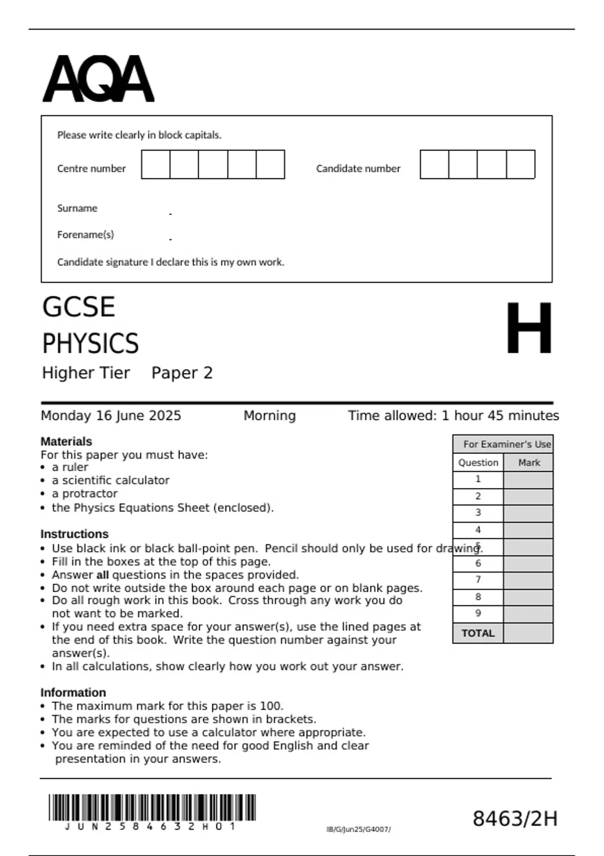 AQA GCSE PHYSICS Paper 2 QUESTION PAPER 2025 (8462/2H