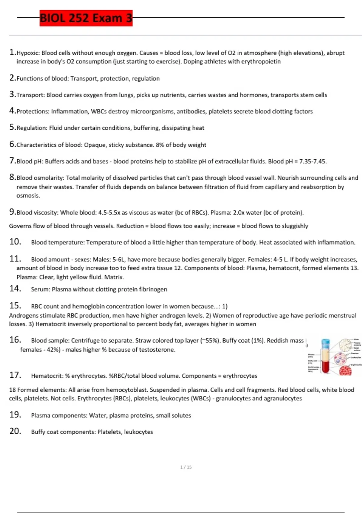 16. Blood sample: Centrifuge to separate. Straw colored top layer (~55%). Buffy coat (1%). Reddish mass (males - 47%,