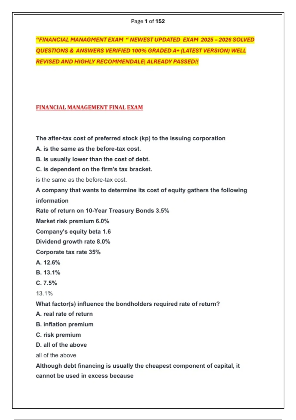 “FINANCIAL MANAGMENT EXAM “ NEWEST UPDATED EXAM 2025 – 2026 SOLVED