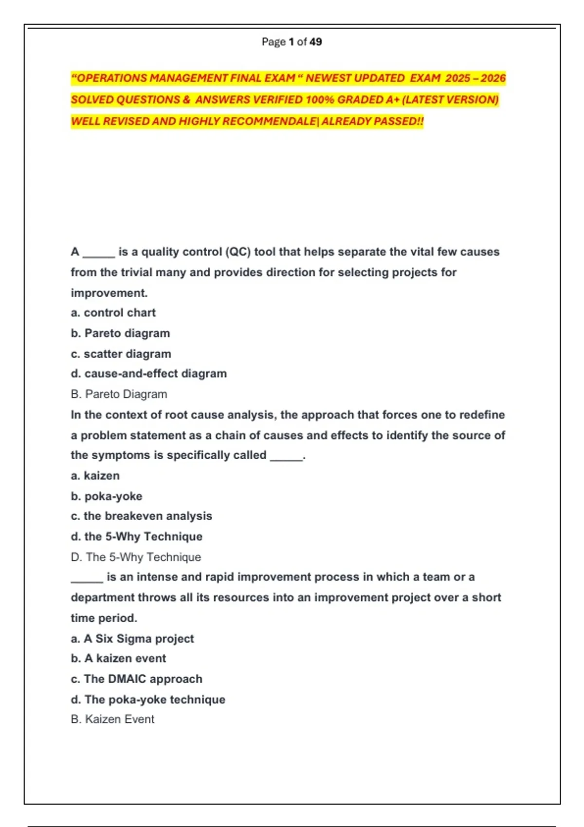 “OPERATIONS MANAGEMENT FINAL EXAM “ NEWEST UPDATED EXAM 2025 – 2026