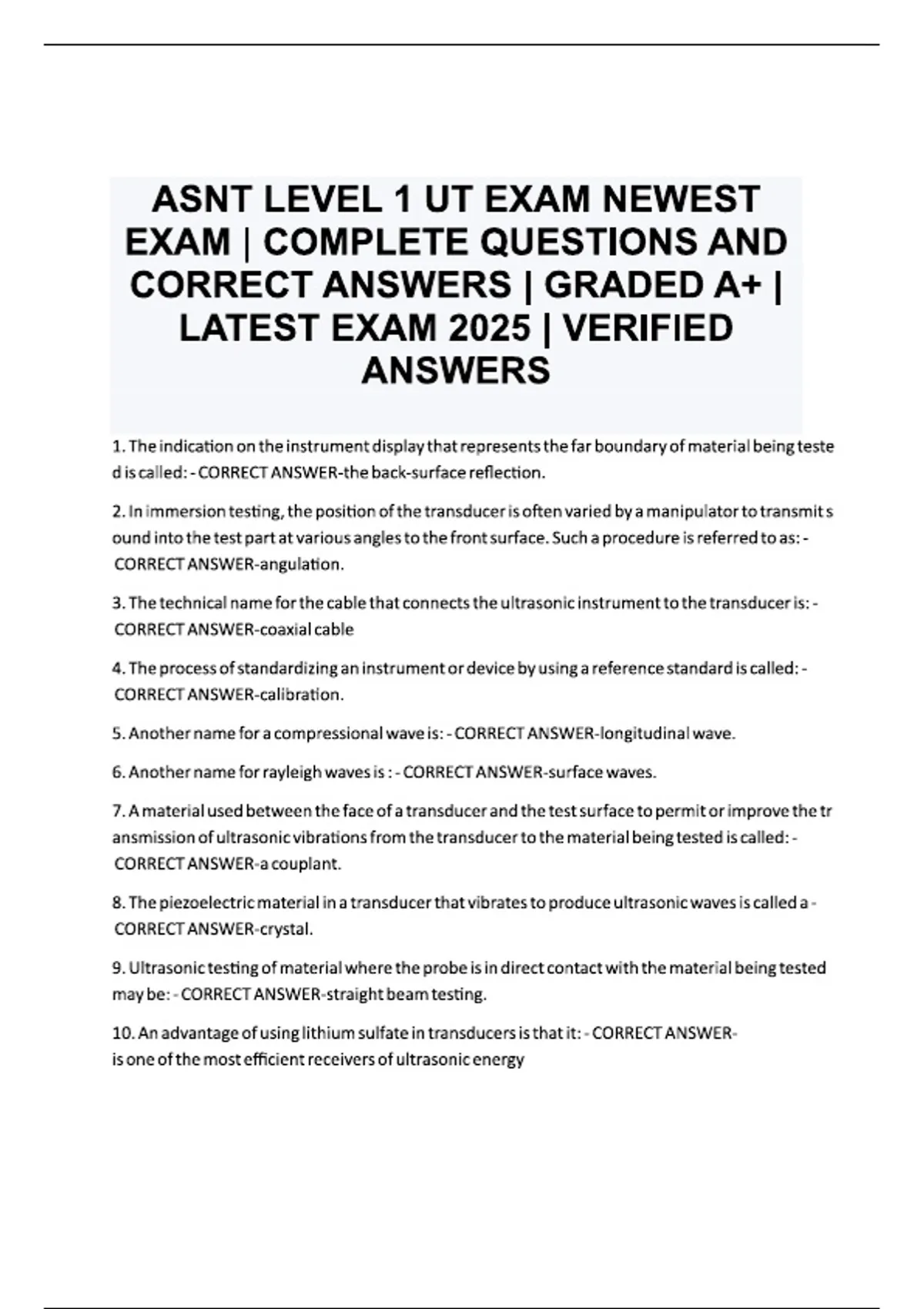 ASNT LEVEL 1 UT EXAM NEWEST EXAM COMPLE... LATEST EXAM 2025 VERIFIED ANSWERS