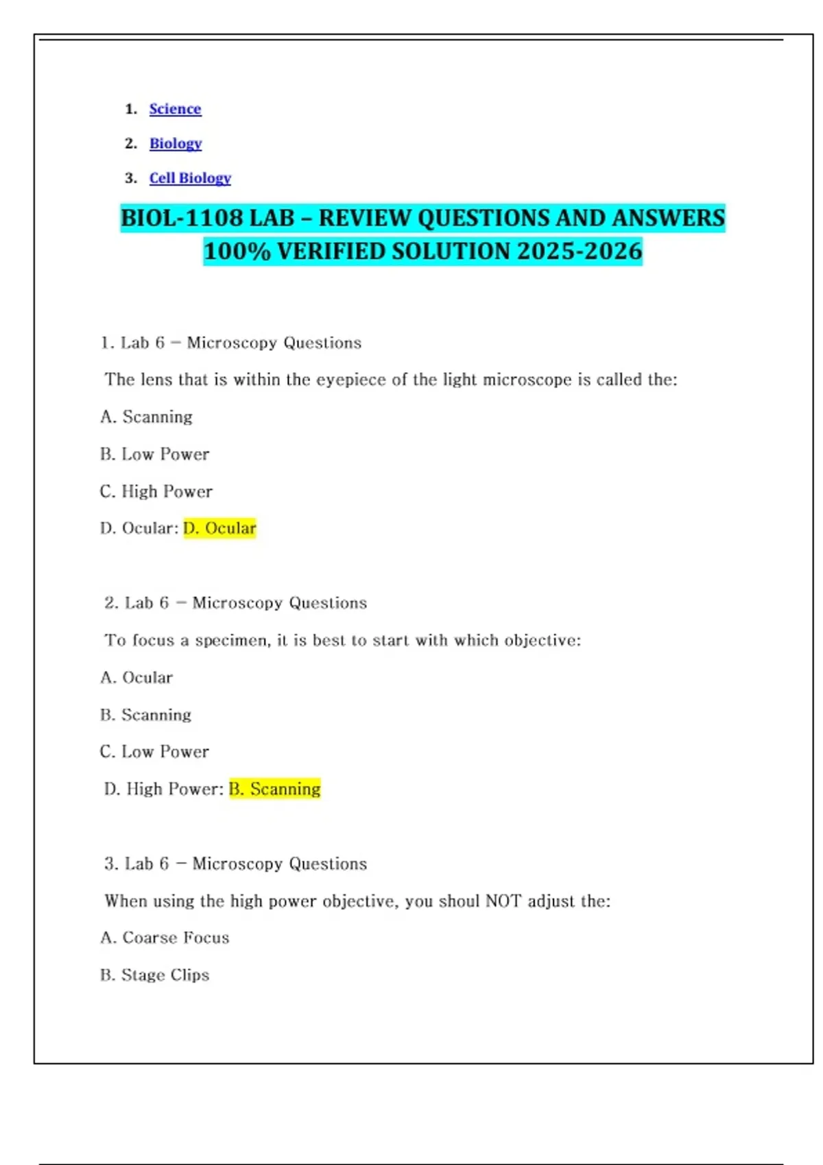 BIOL-1108 LAB – REVIEW QUESTIONS AND ANSWERS 100% VERIFIED SOLUTION
