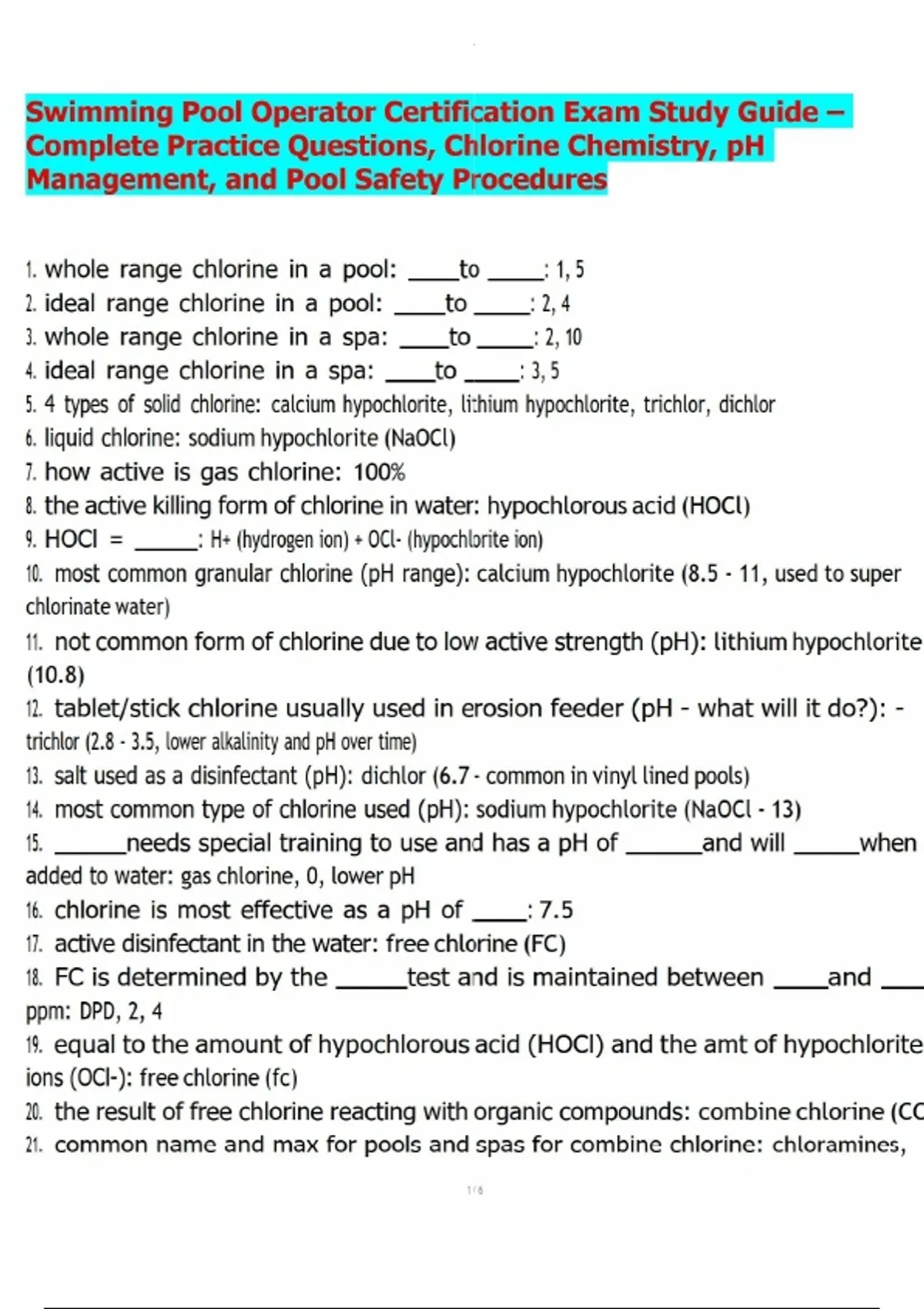 Swimming Pool Operator Certification Exam Study Guide – Complete Practice Questions, Chlorine Chemistry, pH Management, and Pool Safety Procedures.pdf