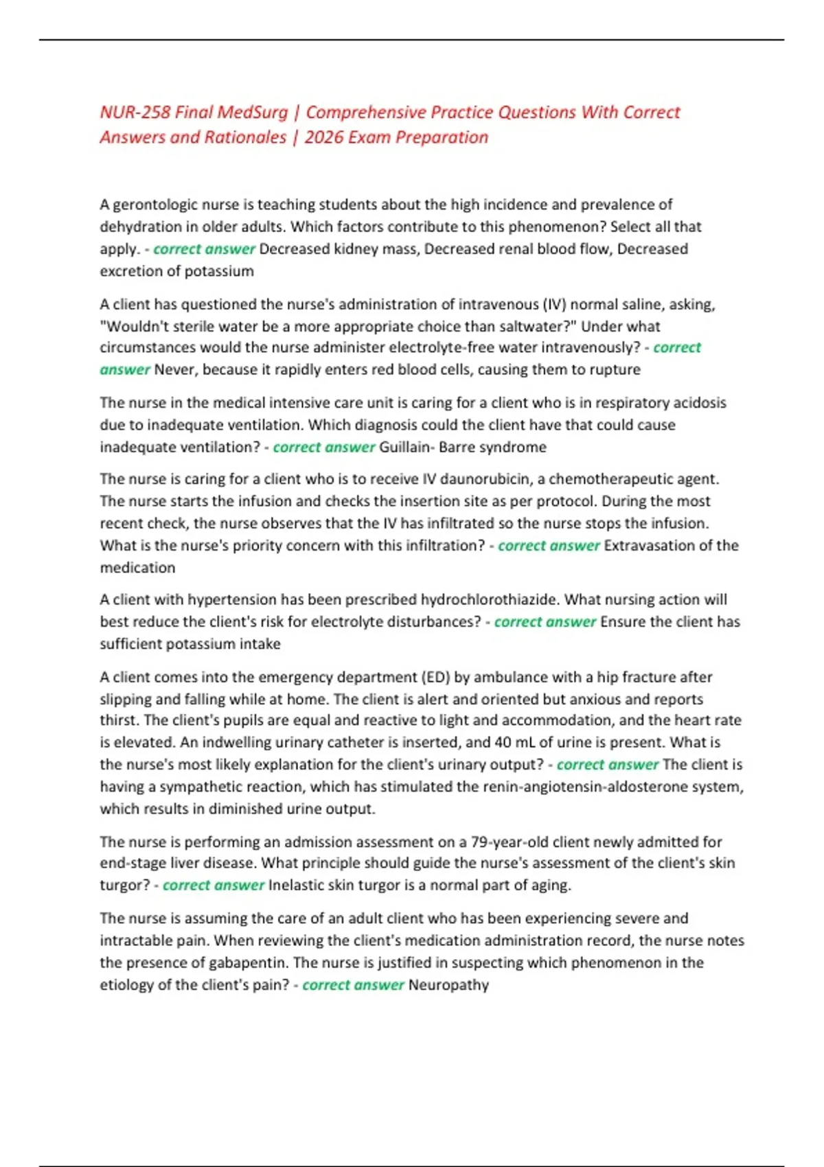 NUR-258 Final MedSurg | Comprehensive Practice Questions With Correct Answers and Rationales | 2026 Exam Preparation