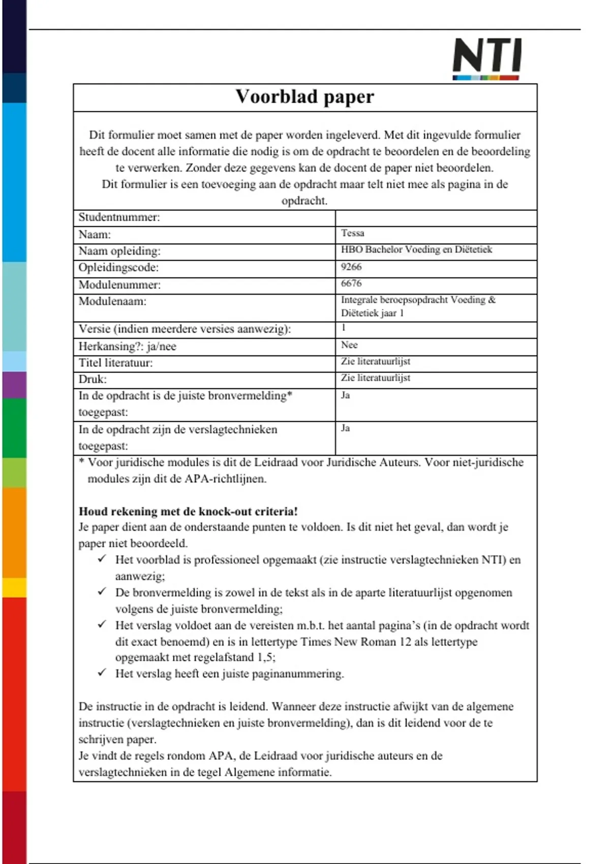 te verwerken. Zonder deze gegevens kan de docent de paper niet beoordelen.