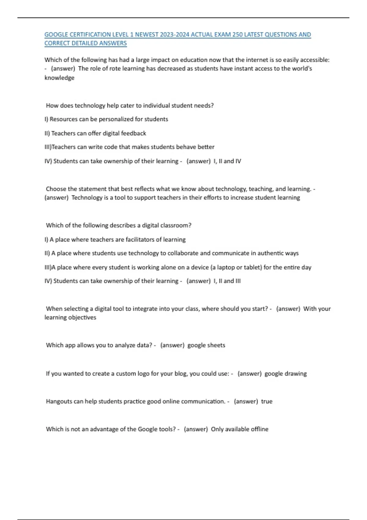 , GOOGLE CERTIFICATION LEVEL 1 NEWEST 2023-2024 ACTUAL EXAM 250 LATEST QUESTIONS AND