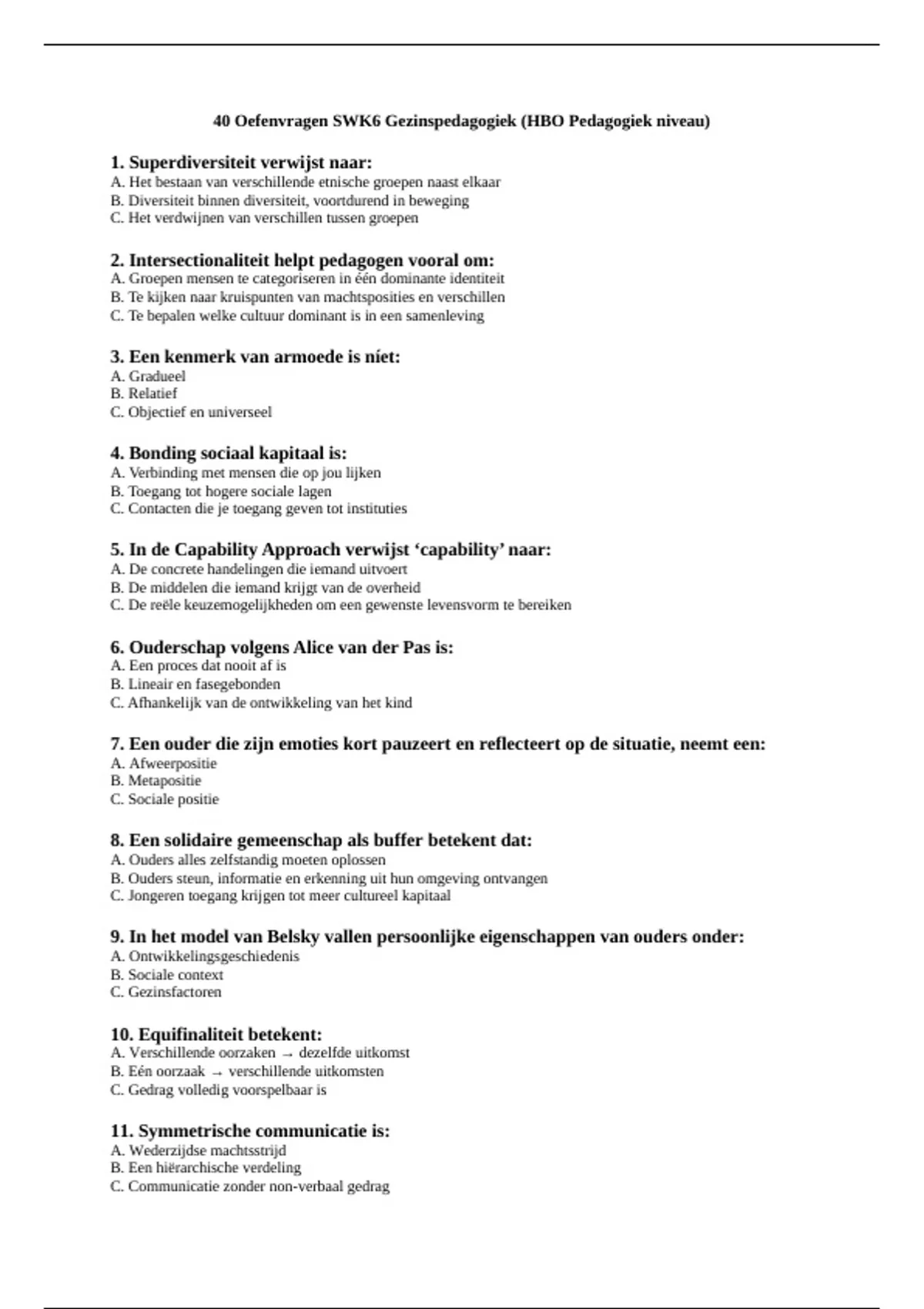 40 Oefenvragen SWK6 Gezinspedagogiek (HBO Pedagogiek niveau)