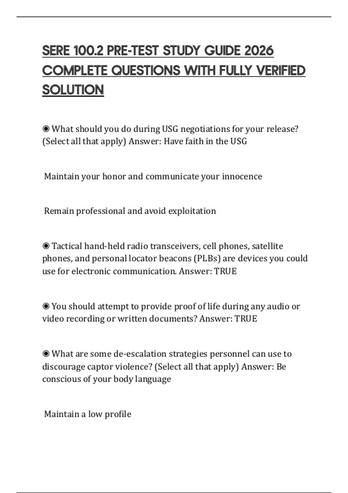 SERE 100.2 PRE-TEST STUDY GUIDE 2026 COMPLETE QUESTIONS WITH FULLY VERIFIED SOLUTION