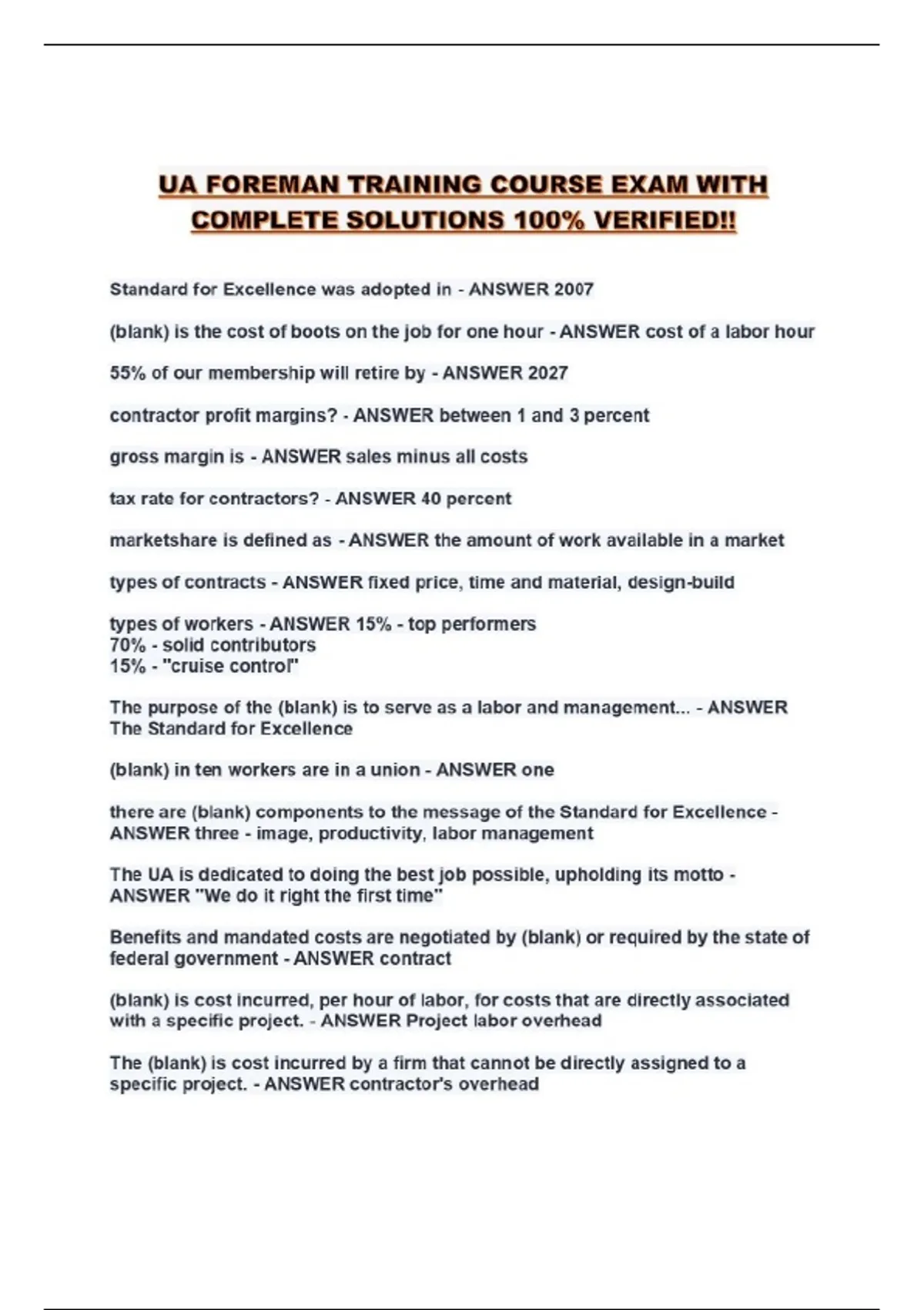 UA FOREMAN TRAINING COURSE EXAM WITH COMPLETE SOLUTIONS 100% VERIFIED!!...