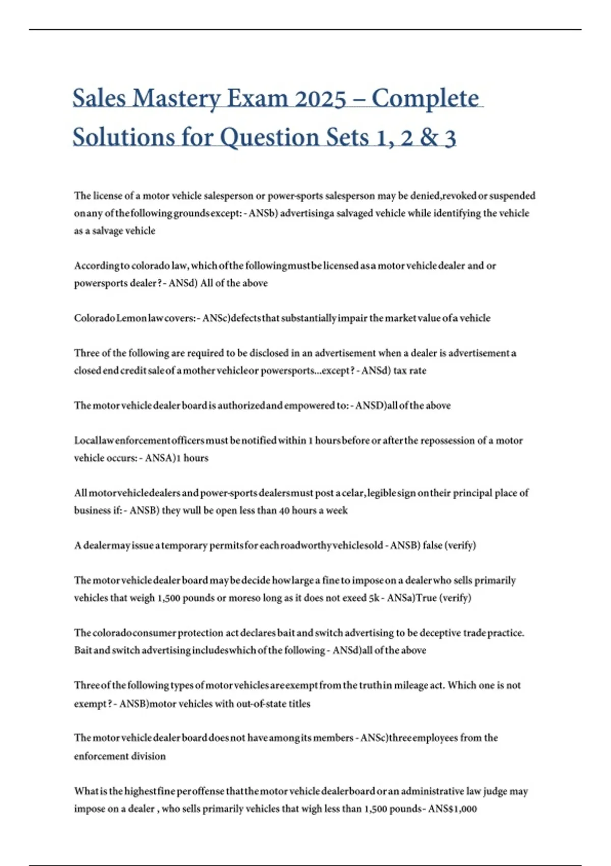 This document provides the updated 2025 Sales Mastery Exam materials, including all questions from Sets 1, 2, and 3 with fully correct and verified solutions. It covers essential sales competencies such as prospecting, lead qualification, value-based selling, objection handling, customer psychology, negotiation strategies, and closing techniques. Designed for comprehensive exam preparation, the content aligns with modern sales practices and supports mastery of real-world selling skills.