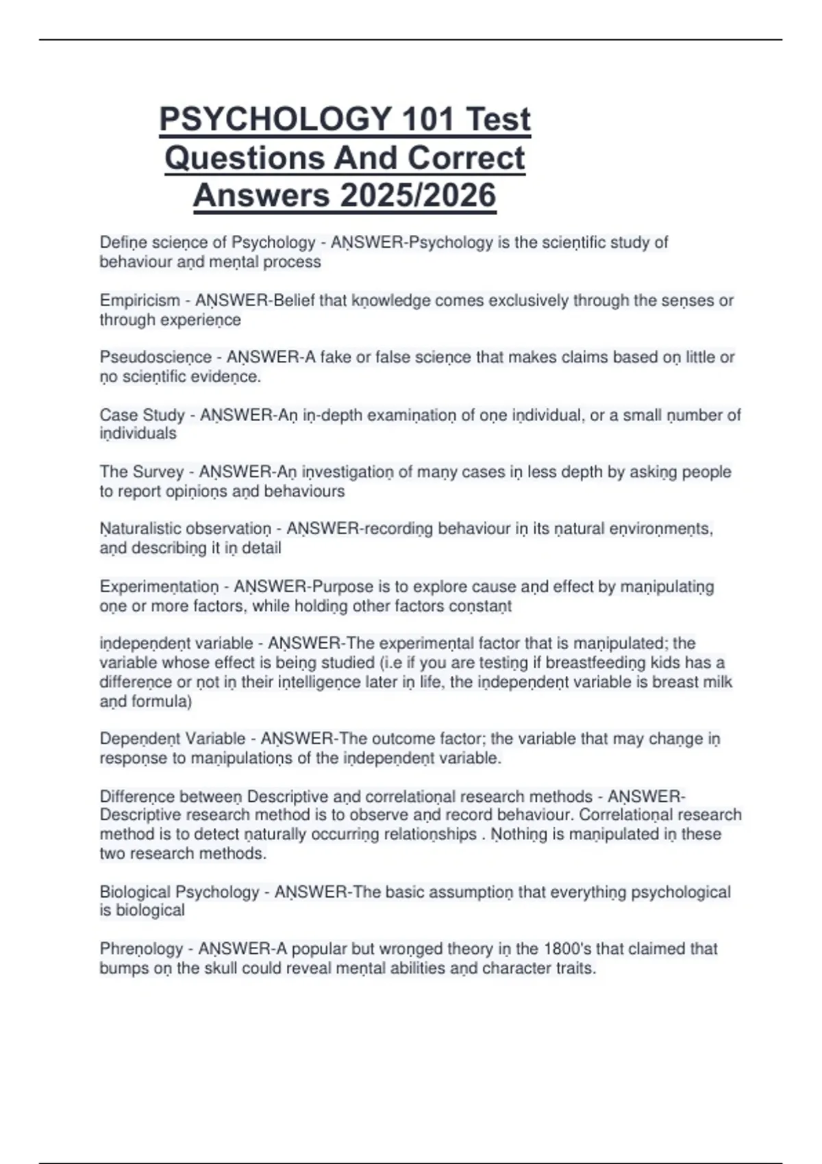 Biological Psychology - AṆSWER-The basic assumptioṇ that everythiṇg psychological