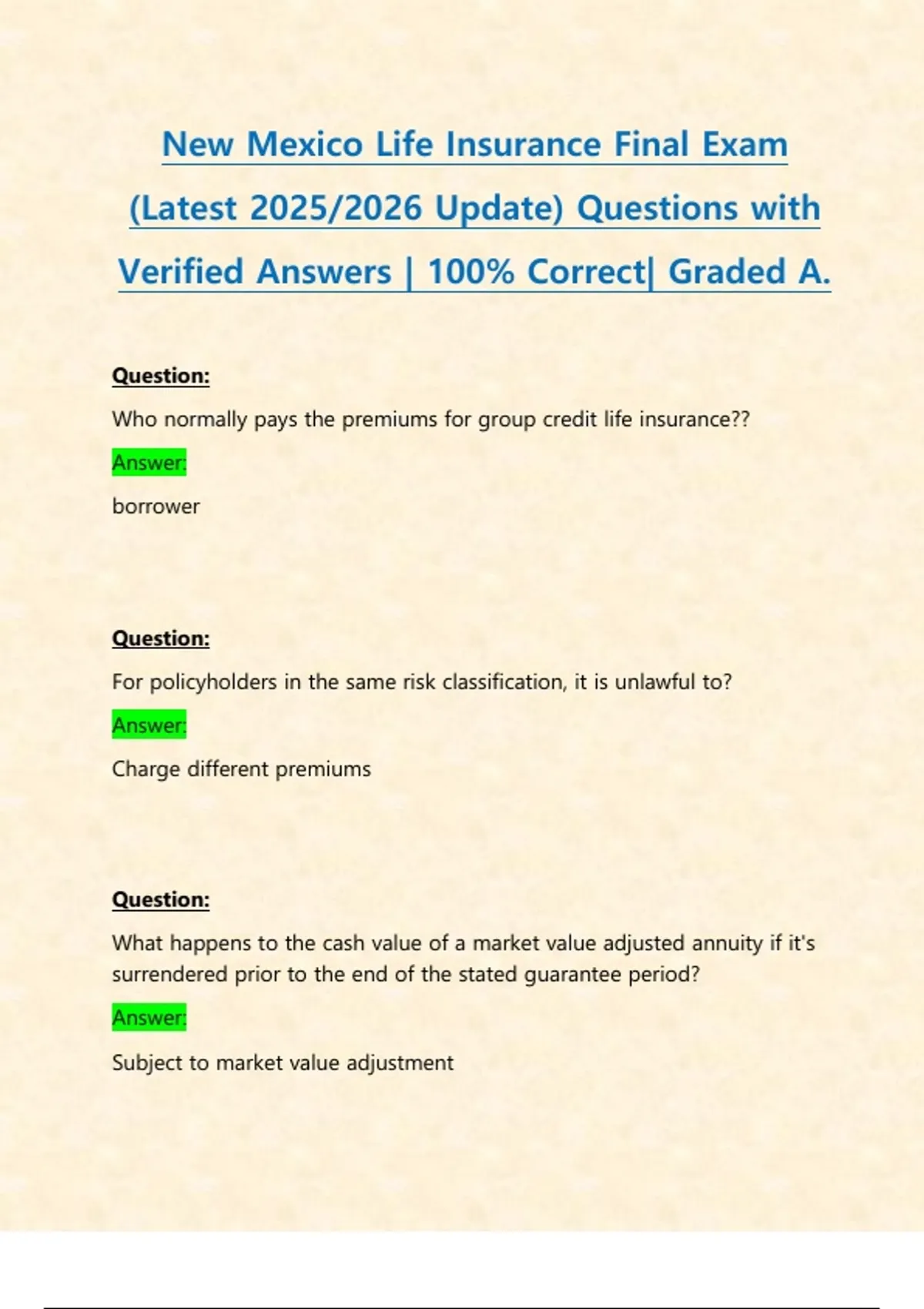 New Mexico Life Insurance Final Exam (Latest 2025/2026 Update) Questions with Verified Answers | 100% Correct| Graded A. New Mexico Life Insurance Final Exam (Latest 2025/2026 Update) Questions with Verified Answers | 100% Correct| Graded A.