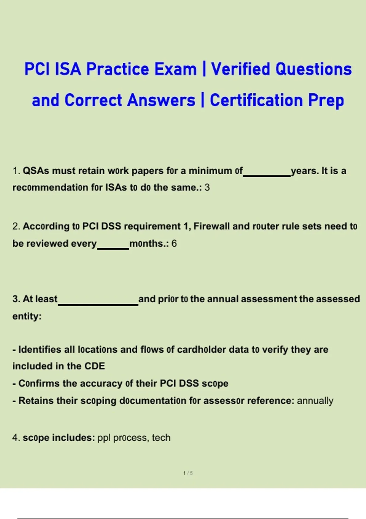 This practice exam set offers verified questions with accurate answers based on the core topics of the PCI Internal Security Assessor certification. It helps you review essential concepts, strengthen exam readiness, and practice with realistic question styles. The material is organized for efficient study and supports learners aiming for confident performance on the PCI ISA certification exam.