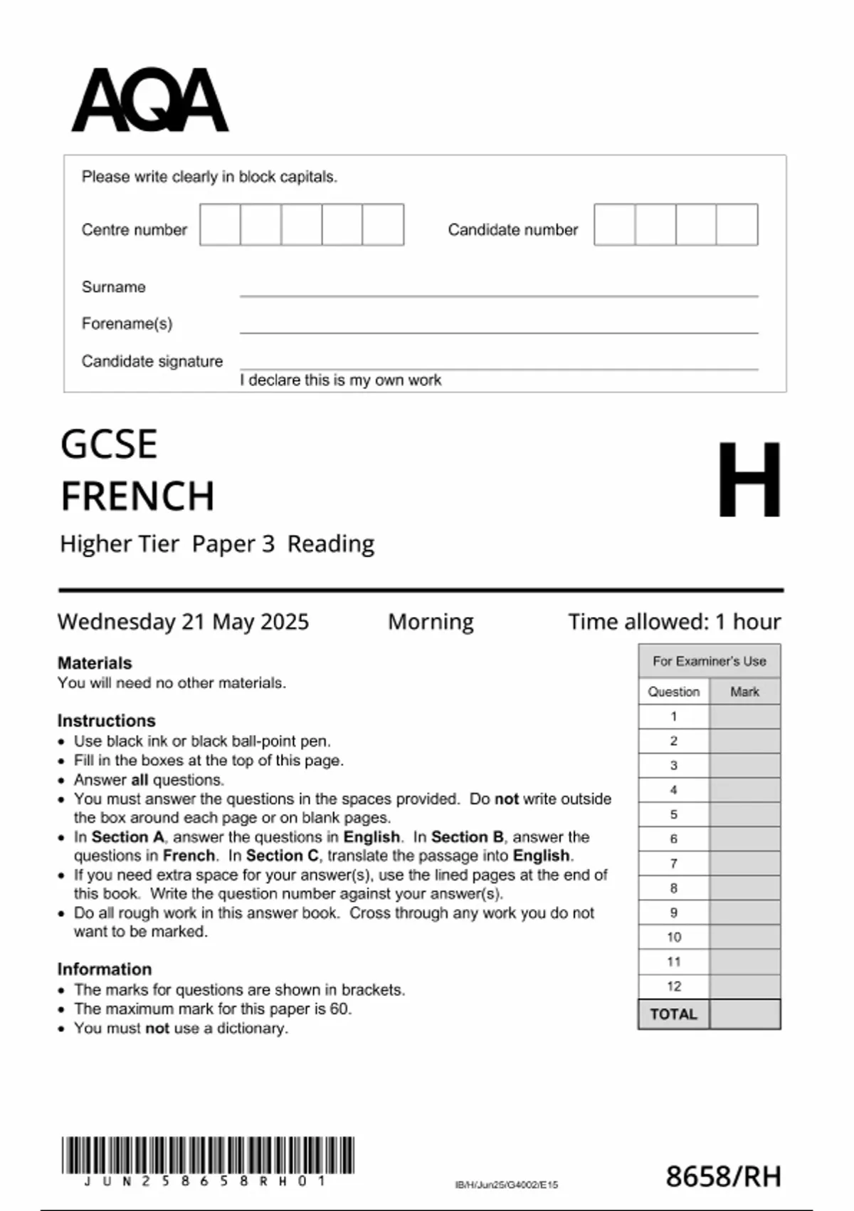 Combined 2025 AQA GCSE FRENCH Paper 3 and Mark Scheme (8658/RH: Reading Higher Tier)