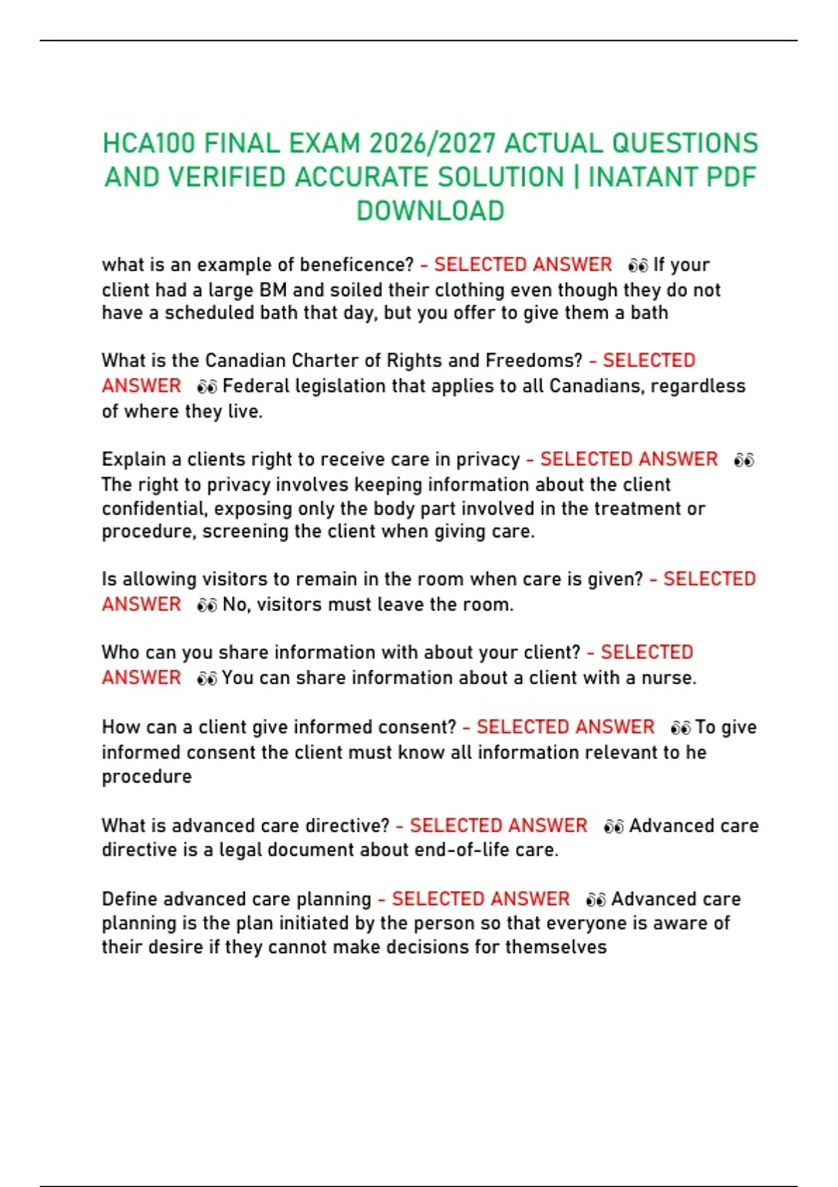 HCA100 FINAL EXAM 2026/2027 ACTUAL QUESTIONS AND VERIFIED ACCURATE SOLUTION | INATANT PDF DOWNLOAD