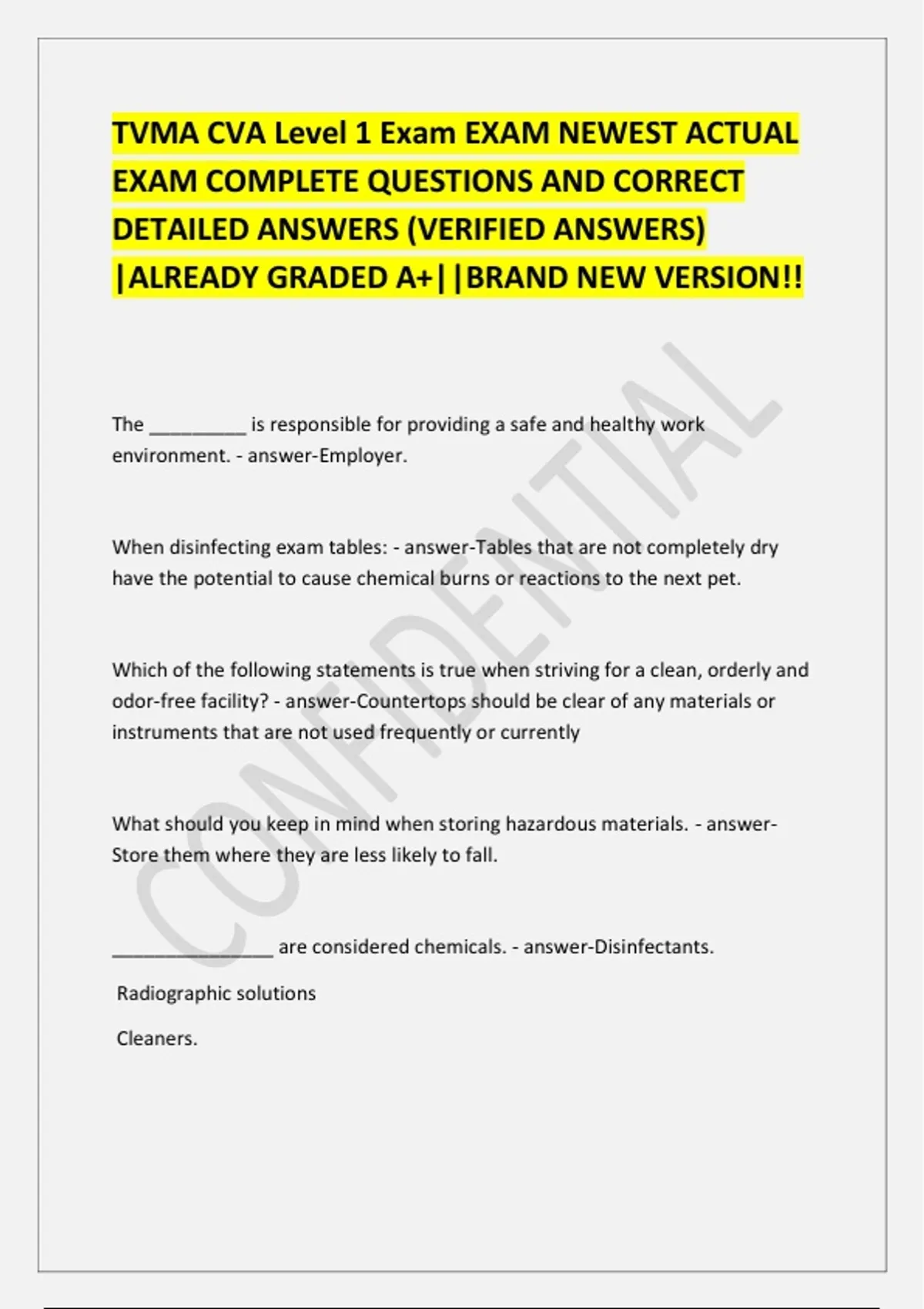 The _________ is responsible for providing a safe and healthy work environment. - answer-Employer. When disinfecting exam tables: - answer-Tables that are not completely dry have the potential to cause chemical burns or reactions to the next pet. Which of the following statements is true when striving for a clean, orderly and odor-free facility? - answer-Countertops should be clear of any materials or instruments that are not used frequently or currently What should you keep in mind when storing hazardous materials. - answerStore them where they are less likely to fall. _______________ are considered chemicals. - answer-Disinfectants. Radiographic solutions Cleaners
