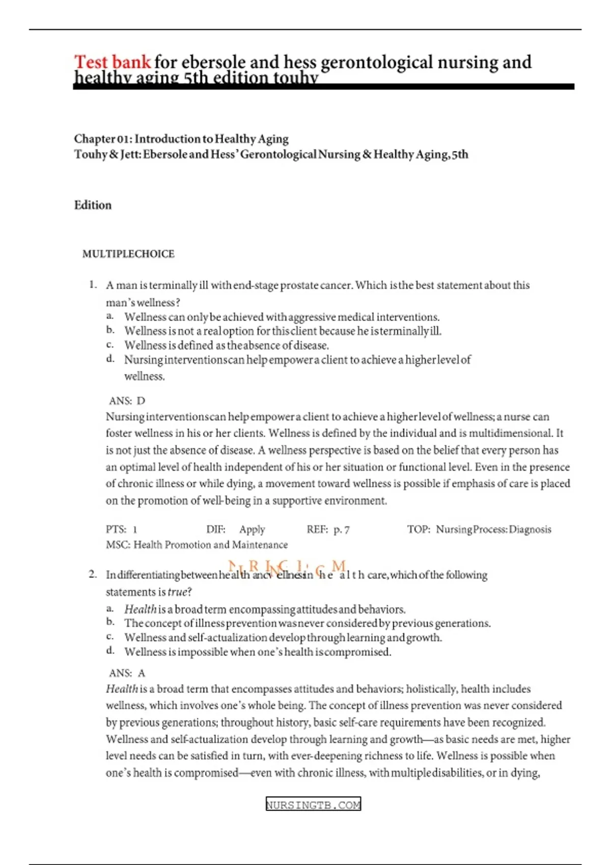 , Ebersole and Hess' Gerontological Nursing and Healthy Aging 5th Edition Touhy Test Bank