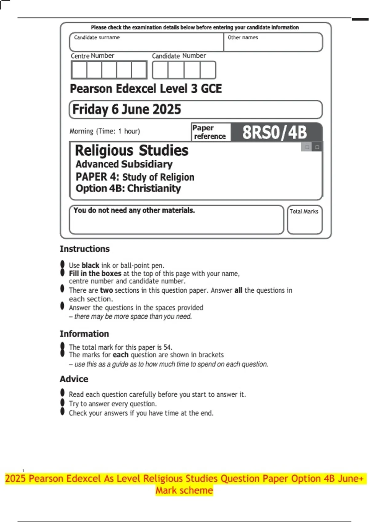 2025 Pearson Edexcel As Level Religious Studies Question Paper Option 4B June+