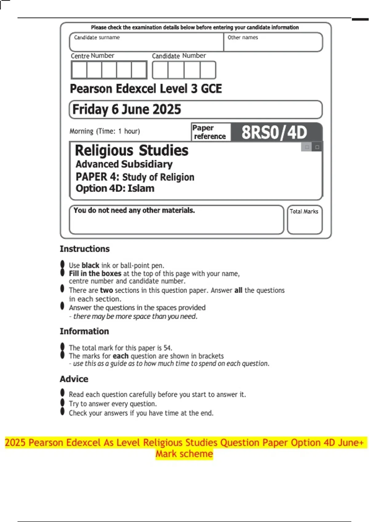 2025 Pearson Edexcel As Level Religious Studies Question Paper Option 4D June + Mark scheme