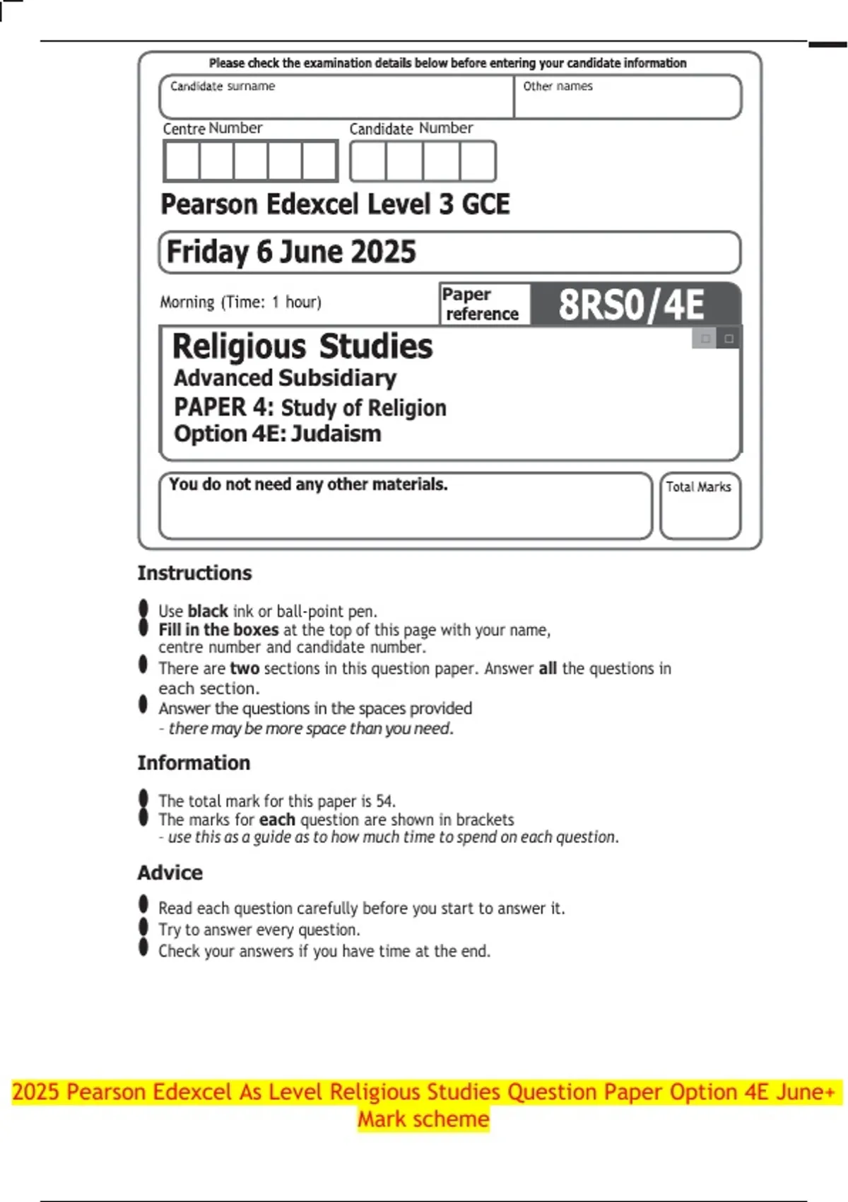 2025 Pearson Edexcel As Level Religious Studies Question Paper Option 4E June+ Mark scheme