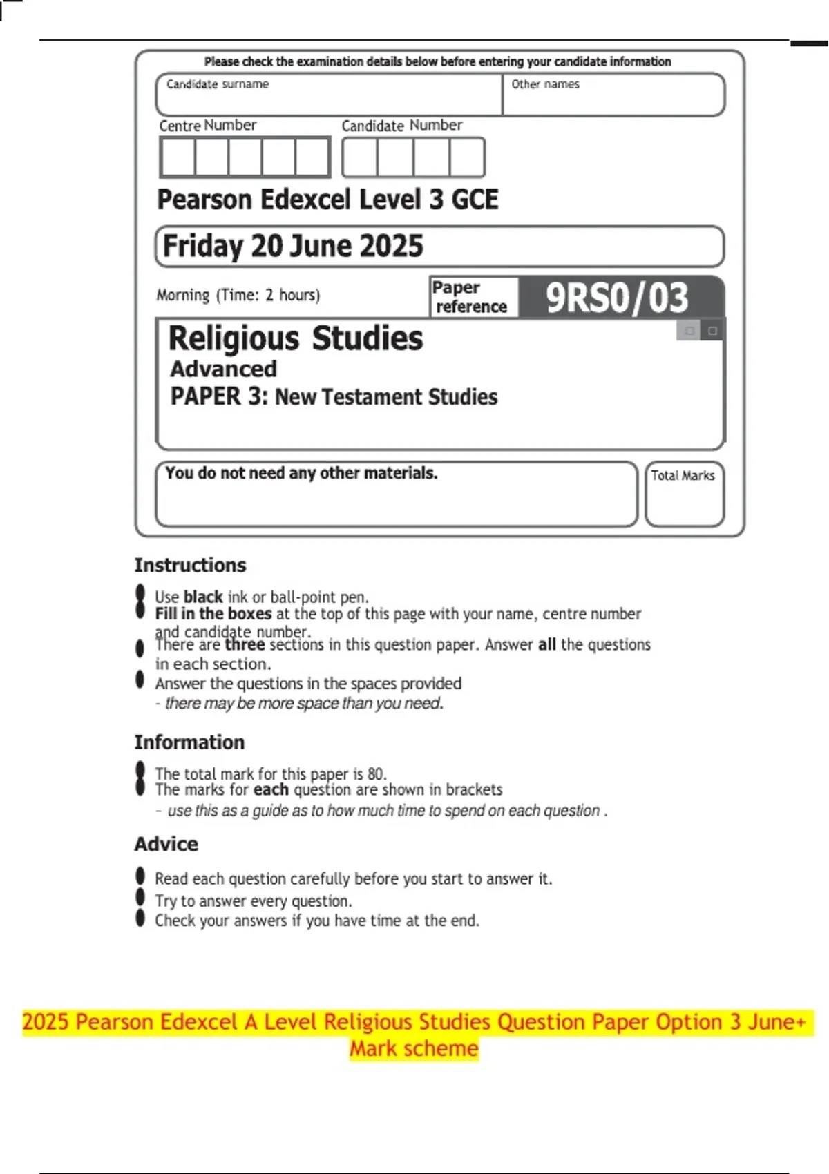 2025 Pearson Edexcel A Level Religious Studies Question Paper Option 3 June+