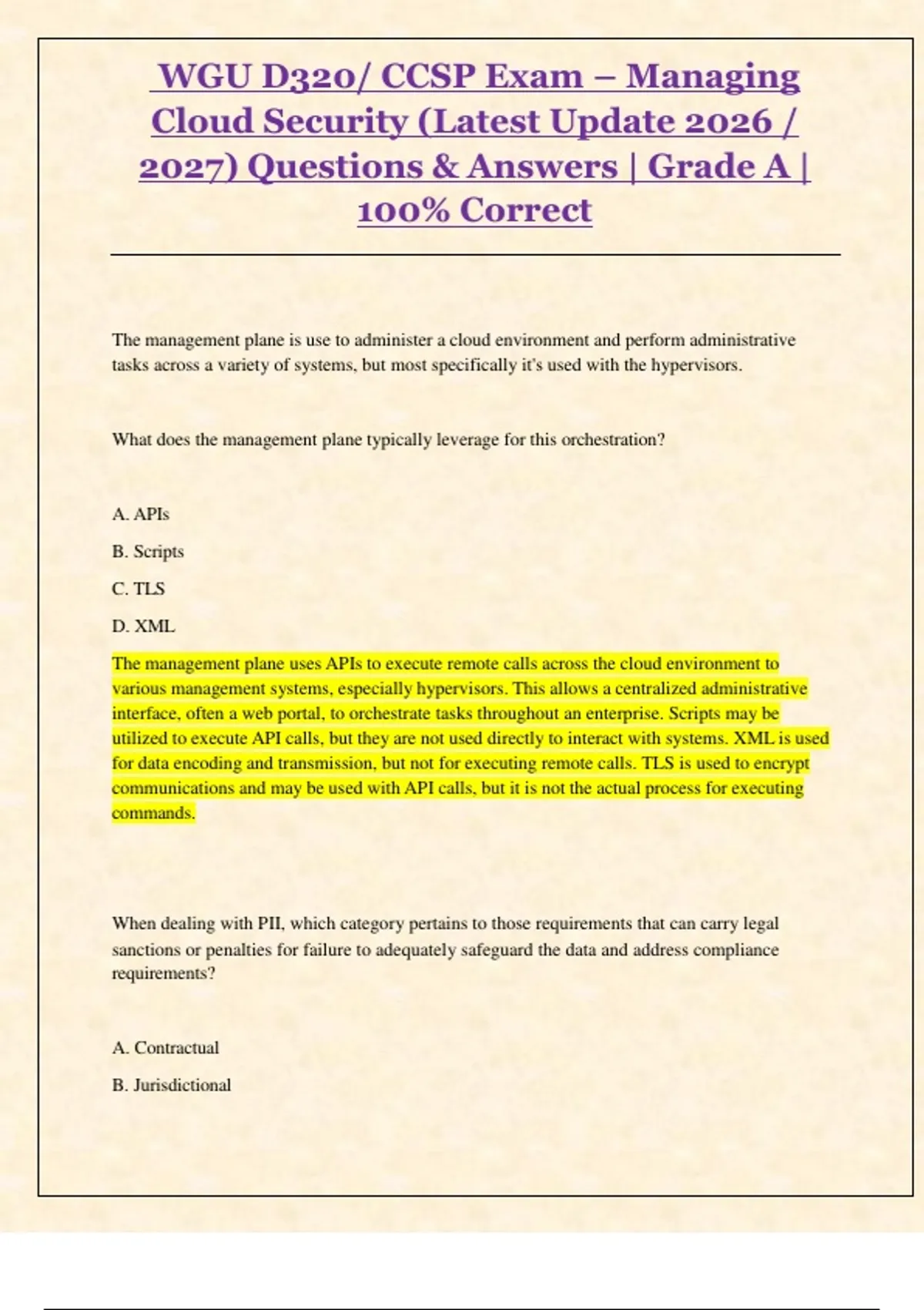 Ace your WGU D320 / CCSP cloud security exam with this comprehensive question-and-answer resource. Carefully curated for the latest 2026/2027 updates, it covers all core topics including cloud architecture, risk management, security controls, compliance, and governance. Designed for fast review, exam prep, and confidence-building, this guide ensures you approach your assessment fully prepared and maximize your chances for top grades.