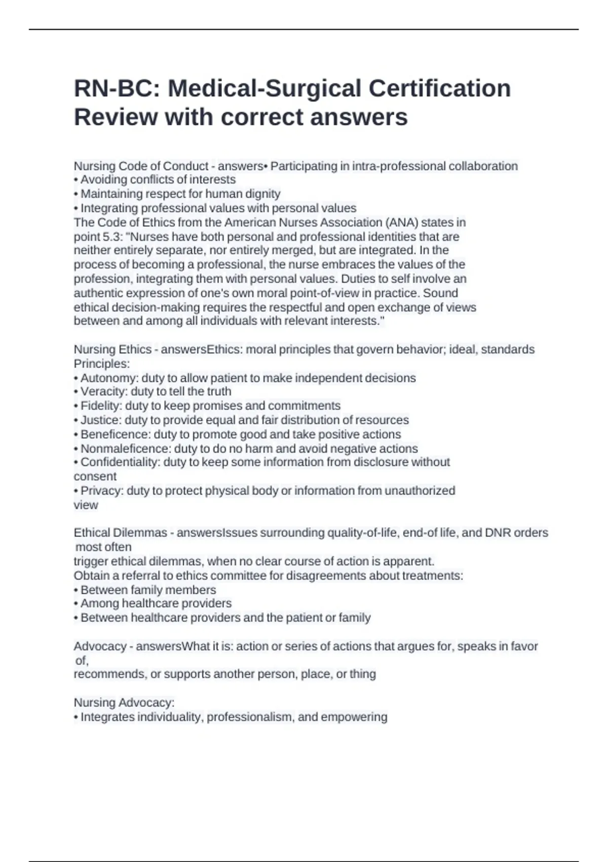 Nursing Ethics - answersEthics: moral principles that govern behavior; ideal, standards