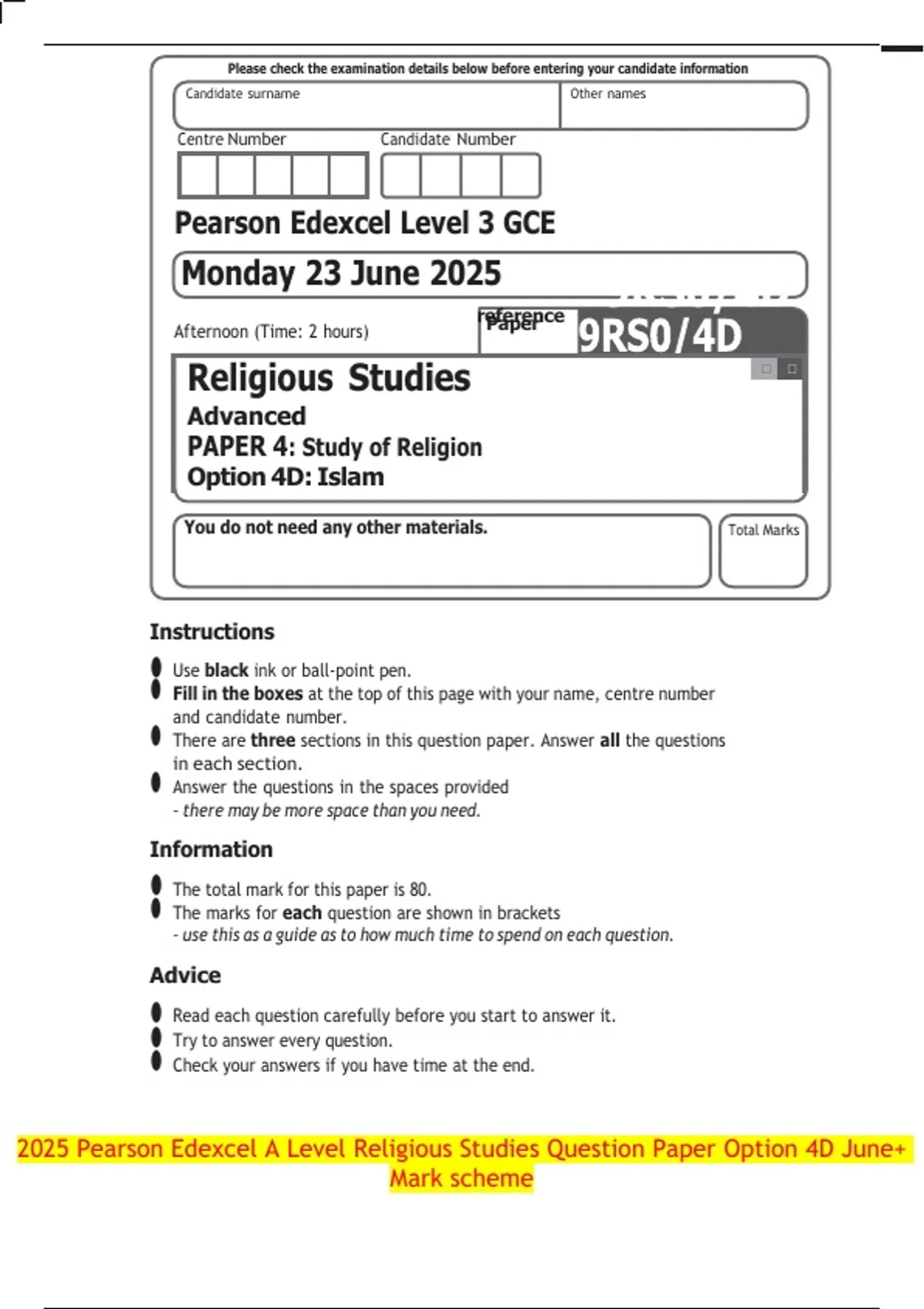 2025 Pearson Edexcel A Level Religious Studies Question Paper Option 4D June+