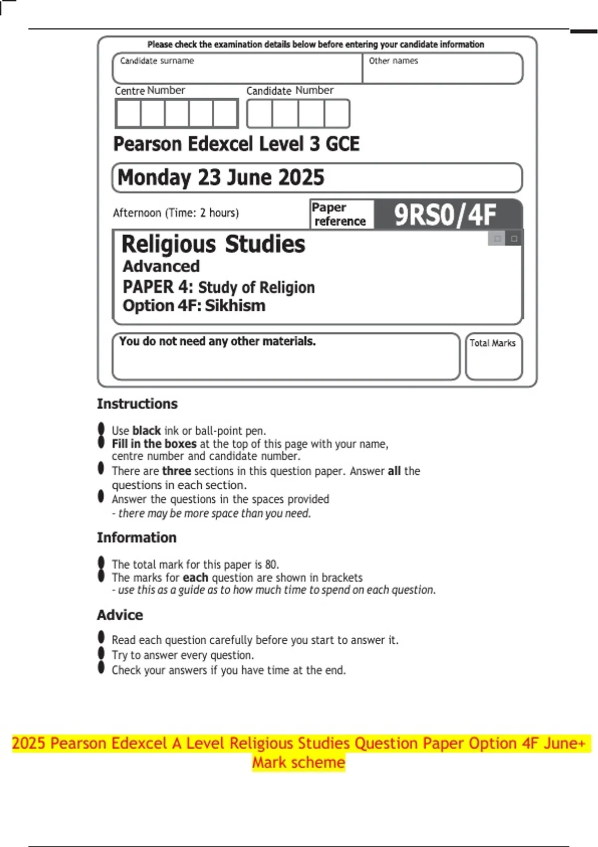2025 Pearson Edexcel A Level Religious Studies Question Paper Option 4F June+