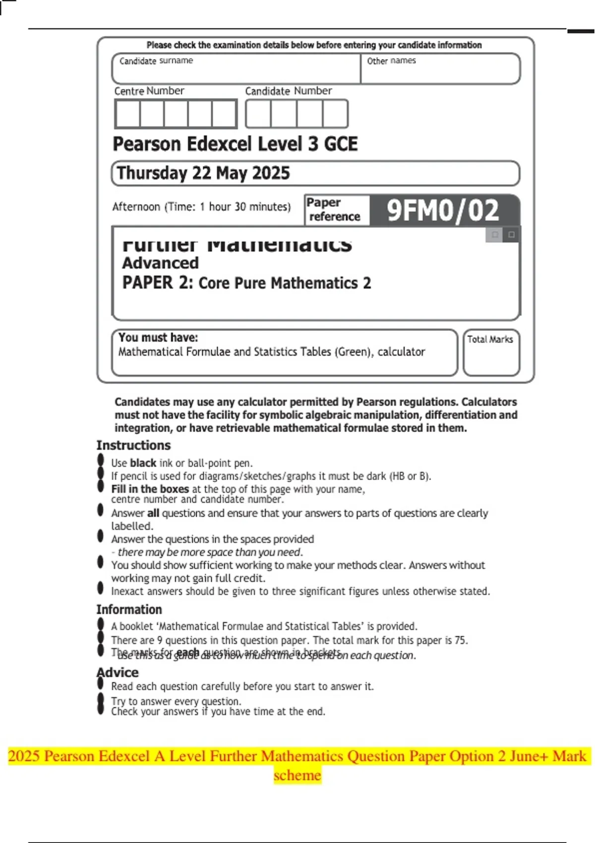 2025 Pearson Edexcel A Level Further Mathematics Question Paper Option 2 June+ Mark