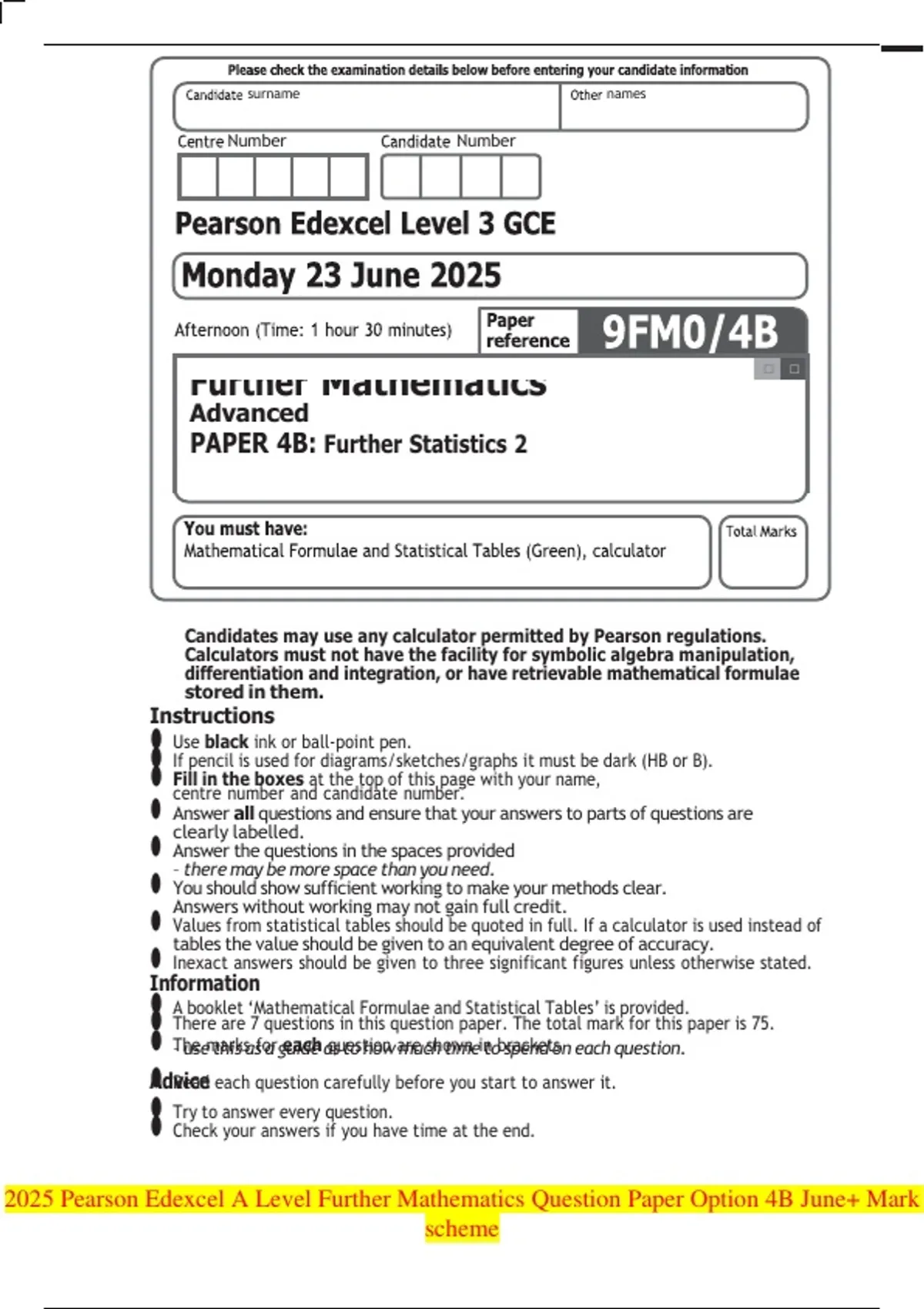 2025 Pearson Edexcel A Level Further Mathematics Question Paper Option 4B June+ Mark