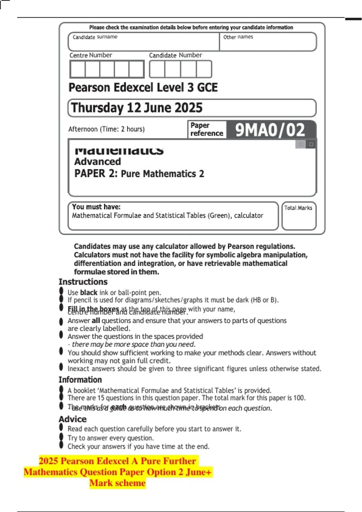 2025 Pearson Edexcel A Pure Mathematics Question Paper Option 2 June+ Mark scheme