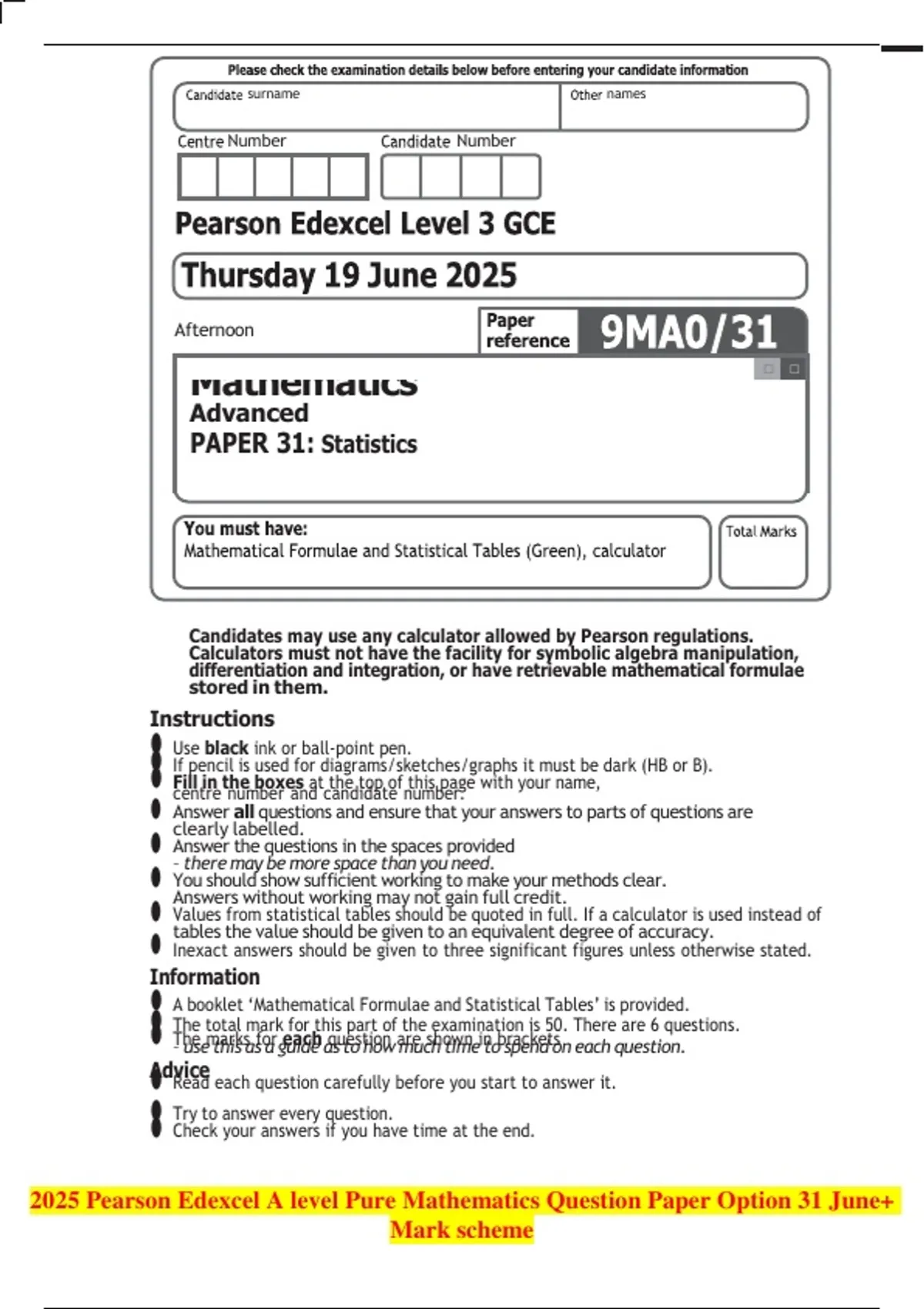 2025 Pearson Edexcel A level Pure Mathematics Question Paper Option 31 June+