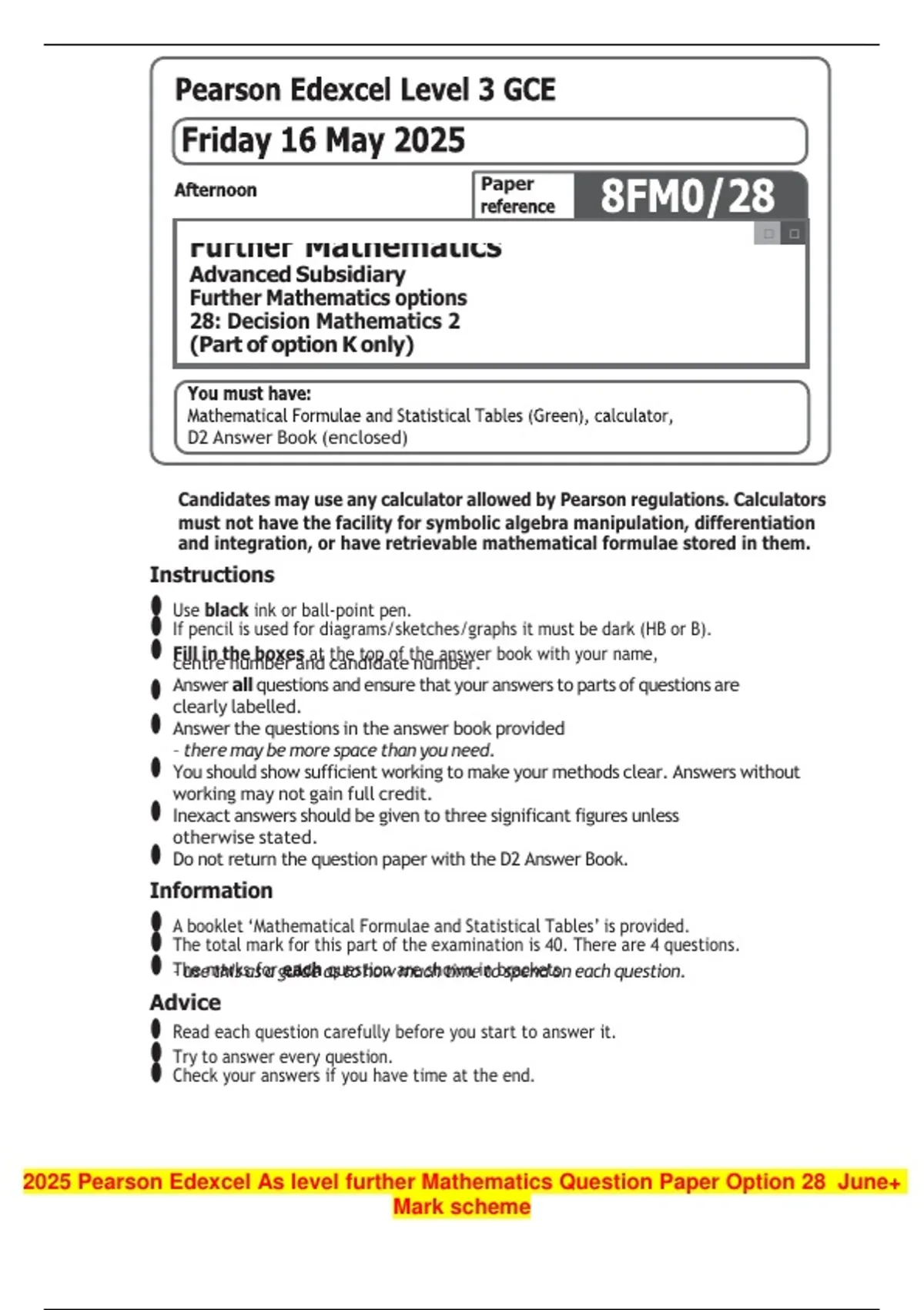 2025 Pearson Edexcel As level further Mathematics Question Paper Option 28 June+
