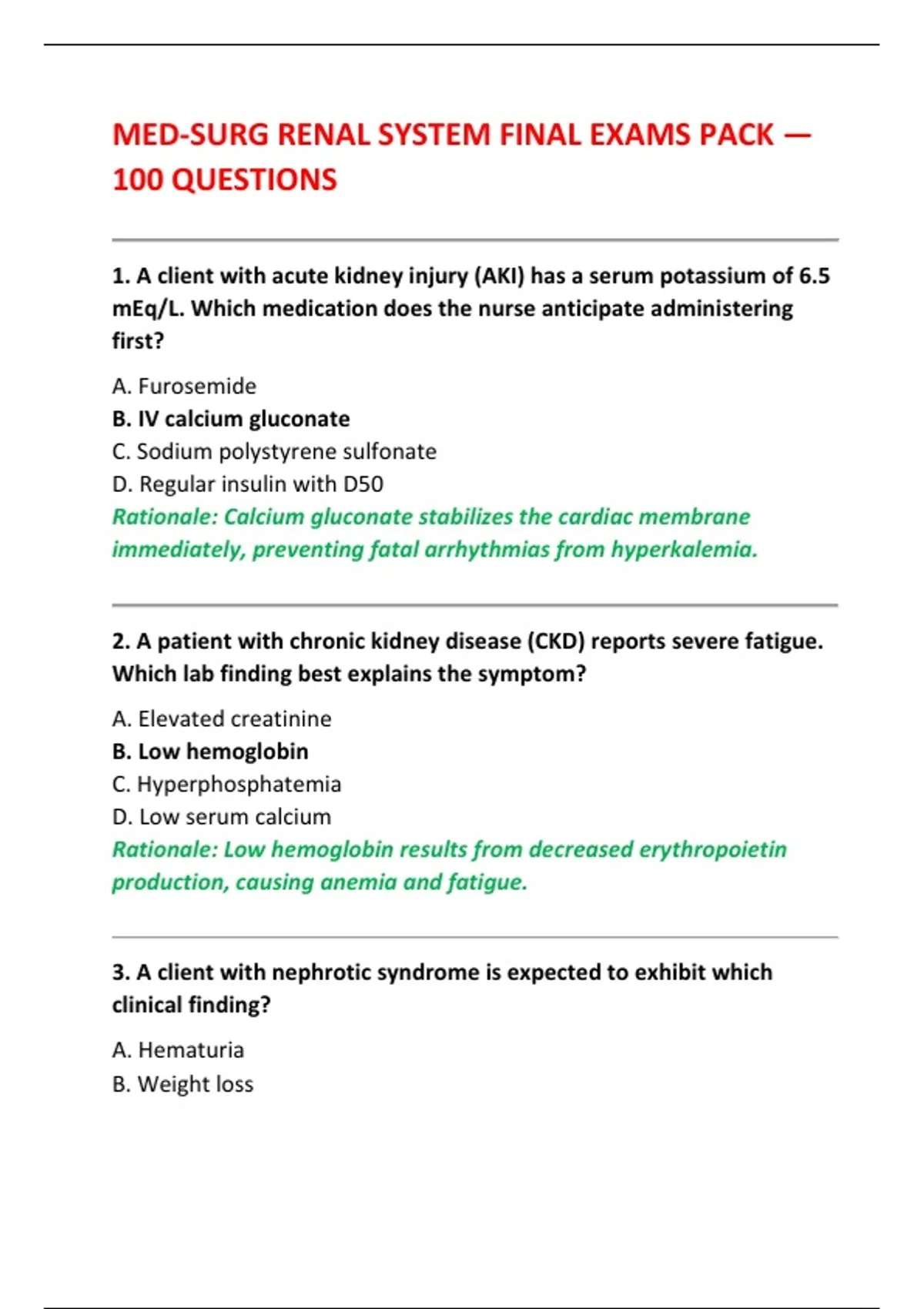 MED-SURG RENAL SYSTEM FINAL EXAMS PACK — 100 QUESTIONS