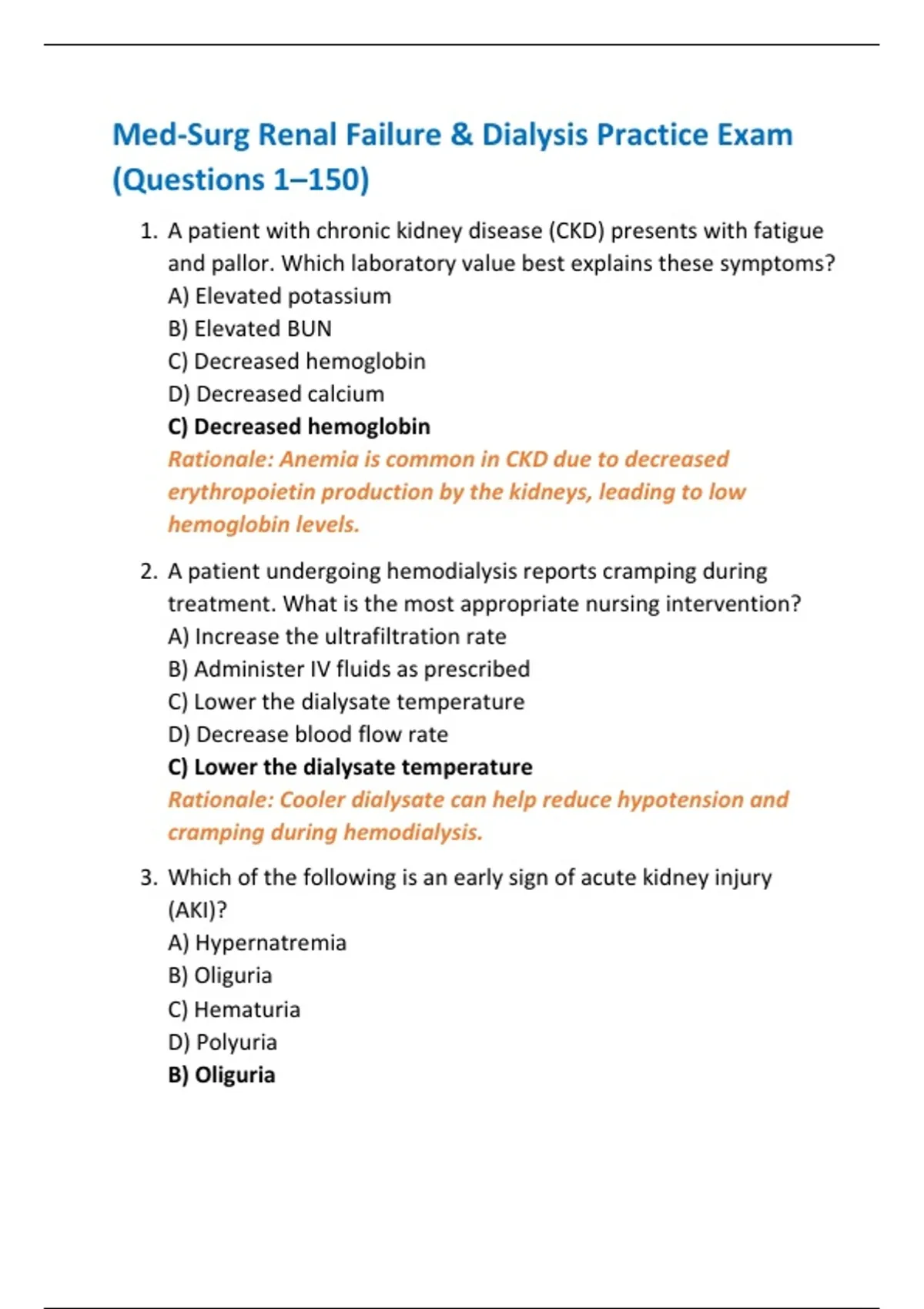 Med-Surg Renal Failure & Dialysis Practice Exam (Questions 1–150)