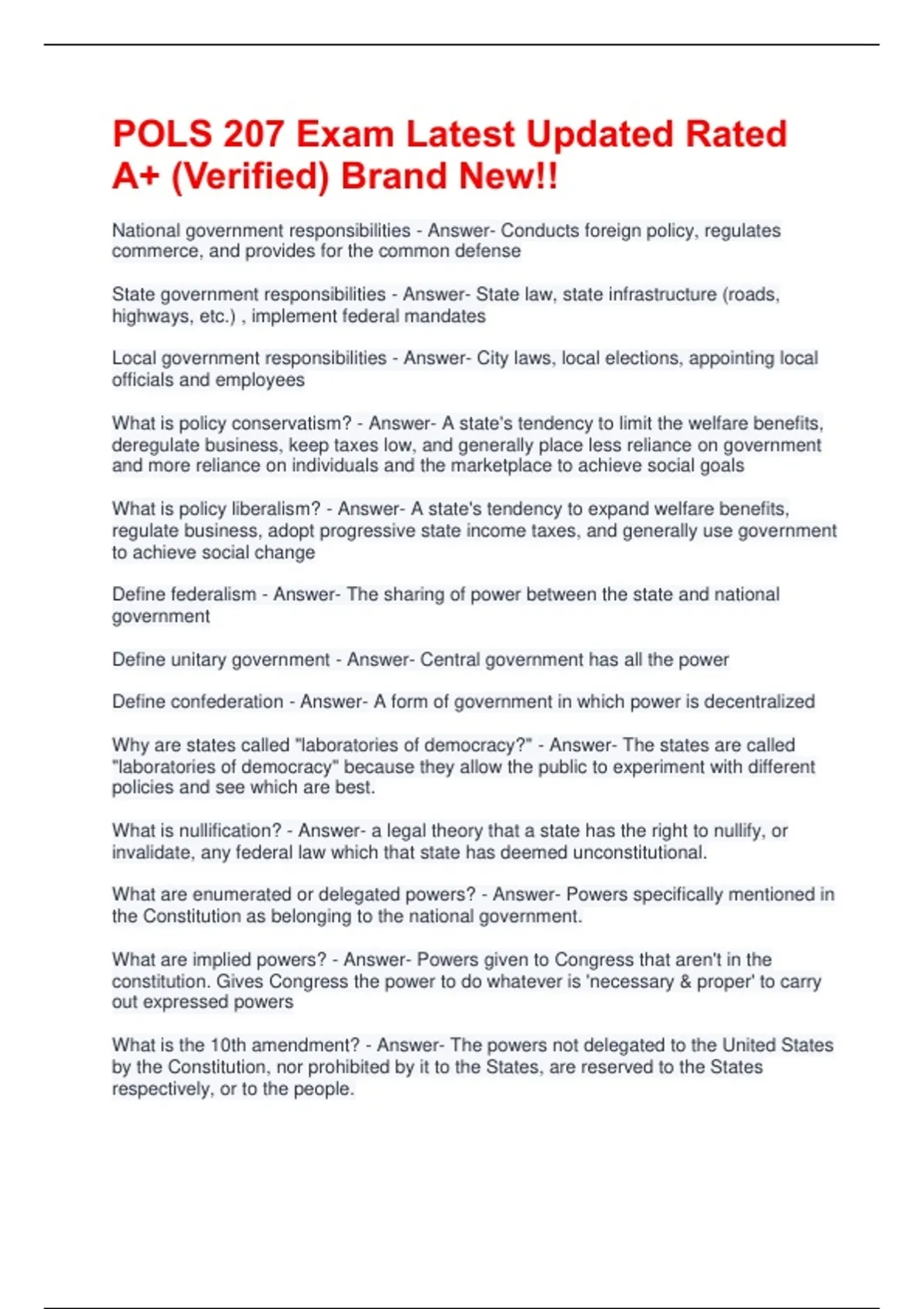 What are enumerated or delegated powers? - Answer- Powers specifically mentioned in