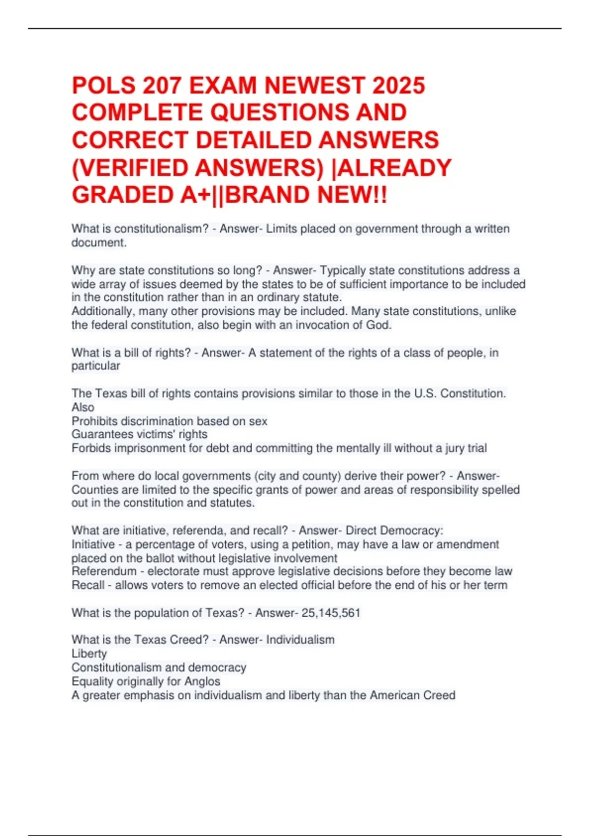 POLS 207 EXAM NEWEST 2025 COMPLETE QUESTIONS AND CORRECT DETAILED ANSWERS (VERIFIED ANSWERS) |ALREADY GRADED A+||BRAND NEW!! What is constitutionalism? - Answer- Limits placed on government through a written document. Why are state constitutions so long? - Answer- Typically state constitutions address a wide array of issues deemed by the states to be of sufficient importance to be included in the constitution rather than in an ordinary statute. Additionally, many other provisions may be included. Many state constitutions, unlike the federal constitution, also begin with an invocation of God. What is a bill of rights? - Answer- A statement of the rights of a class of people, in particular The Texas bill of rights contains provisions similar to those in the U.S. Constitution. Also Prohibits discrimination based on sex Guarantees victims' rights Forbids imprisonment for debt and committing the mentally ill without a jury trial From where do local governments (city and county) derive their power? - Answer- Counties are limited to the specific grants of power and areas of responsibility spelled out in the constitution and statutes. What are initiative, referenda, and recall? - Answer- Direct Democracy: Initiative - a percentage of voters, using a petition, may have a law or amendment placed on the ballot without legislative involvement Referendum - electorate must approve legislative decisions before they become law Recall - allows voters to remove an elected official before the end of his or her term What is the population of Texas? - Answer- 25,145,561 What is the Texas Creed? - Answer- Individualism Liberty Constitutionalism and democracy Equality originally for Anglos A greater emphasis on individualism and liberty than the American Creed Know the historical development of the Texas economy to the present day - Answer- -The first real economy in texas was cotton. Still today Texas produces a large percentage of the nations cotton -Cattle became big in the late 1800's. Texas is still ranked high for states with big cattle production. -For most of the 1900's petroleum was the basis for the Texas economy. - Today texas has a very diverse economy including all of the above plus it has become a highly technologically based economy What is the relationship between poverty and political participation? - Answer- Poor people do not usually participate actively and routinely in politics and government in Texas or in other states. Know the political culture of Texas - Answer- -Moralistic -Government is a public service -Individualistic:Government has an active role to maintain dominant social and religious values. -Government should be limited -Traditionalistic:Government should further private enterprise. -Little intervention into private lives -Government should preserve the status quo Know the constitutional development of Texas - Answer- -1836 Texas Constitution: Just declared independence from mexico. The constitution set up a Gov. similar to that of the u.s. -1845 texas constitution: Texas joined with the u.s. and wrote a new constitution. The constitution as straightforward and simple -1861 texas constitution: Texas secedes ate the beginning of the civil war. They make changes to the 1845 constitution. -1866 texas constitution:Texas reenters the union. Federal reconstruction that changes be made in the texas constitution. -1869 constitution: after reconstruction ended Texas was required by the union to make more changes to their constitution. -1876 and current constitution: Revised the constitution as a reaction to reconstruction and a dislike for the 1869 constitution. Know the differences between the U.S. Constitution and Texas Constitution - Answer- - The U.S. constitution is a liberal constitution. It has general principles stated in broad terms. 27 amendments -The Texas constitution is a Statutory constitution. It has very detailed provisions. it has 467 amendments Know the amendment process for the Texas Constitution - Answer- Proposal of amendments Must be by two-thirds of the total membership of each house of the legislature Ratification of amendments Requires approval by voters in either a general or a special election Historically, voters have approved more than 70% of proposed amendments What was the result of the 1974 constitutional convention? - Answer- Representatives called for a Constitutional Convention to to reconstruct a new constitution. The constitution fell three votes short of 2/3's What does right-to-work mean? - Answer- membership or nonmembership in a union cannot be a condition of employment. Why has Texas not significantly revised its constitution? - Answer- -Obstacles to a Major Revision: Texans suspicion of government Groups use amendment process to advance their priorities Low public participation in amendment process -Prospects for a Major Revision: Limited benefits to legislators who seek revision Citizen education What does home rule mean? - Answer- Home-Rule City: Population over 5,000 may choose by majority vote to become a home-rule city. Can adopt its own charter Can choose its structure The Texas Constitution allows home-rule cities to retain its home-rule designation if the population drops below 5,000. More flexible than general-law cities Home rule allows local voters to directly participate through: Initiative Referendum Recall. The right and authority of a local government to govern itself, rather than have the state govern it. How many counties does Texas have? - Answer- 254 What is the governing body of a county in Texas? - Answer- Governing body is the commissioners court. 4 commissioners elected for 4 year terms Elected in single-member precincts Responsible for the construction and maintenance of roads and bridges The county judge is elected for 4 year terms. County judge presides over the commissioners court.