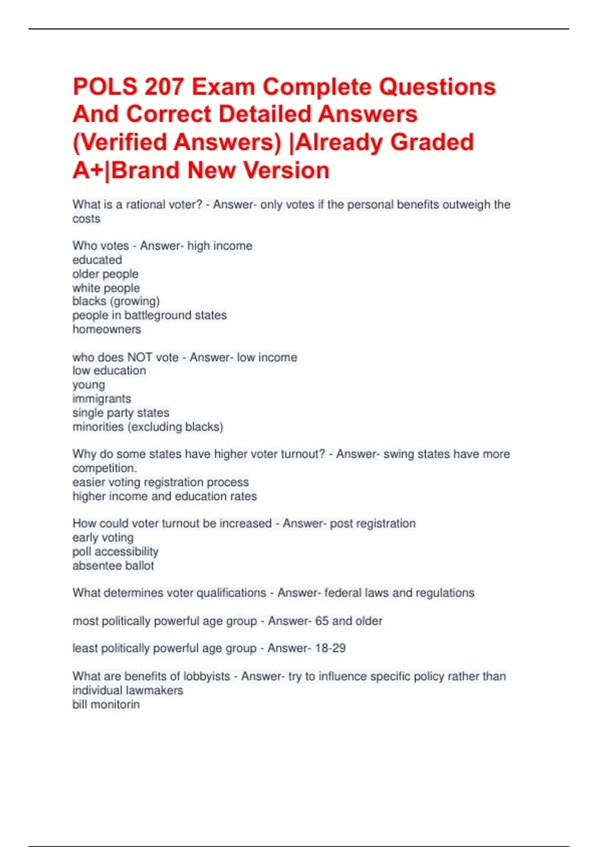 POLS 207 Exam Complete Questions And Correct Detailed Answers (Verified Answers) |Already Graded A+|Brand New Version What is a rational voter? - Answer- only votes if the personal benefits outweigh the costs Who votes - Answer- high income educated older people white people blacks (growing) people in battleground states homeowners who does NOT vote - Answer- low income low education young immigrants single party states minorities (excluding blacks) Why do some states have higher voter turnout? - Answer- swing states have more competition. easier voting registration process higher income and education rates How could voter turnout be increased - Answer- post registration early voting poll accessibility absentee ballot What determines voter qualifications - Answer- federal laws and regulations most politically powerful age group - Answer- 65 and older least politically powerful age group - Answer- 18-29 What are benefits of lobbyists - Answer- try to influence specific policy rather than individual lawmakers bill monitorin write legislation PACs and media campaigns what is grassroots lobbying - Answer- lobbyists target constituents rather than individual lawmakers and ask constituents to contact their legislatures how do PACs(political action committees) spend their money? - Answer- incumbents How do economics make interest groups different in states - Answer- interest group influence is higher when industry dominates the economy and politics interest groups, party explanation - Answer- strong parties make interest groups weak interest groups, professional explanation - Answer- professional legislatures make interest groups weak governmental fragmentation explantion - Answer- states with weak governors have strong interest groups Know the responsible party model - Answer- each party offers clear policy alternatives offers clear policy alternatives and holds their elected officials responsible for enacting these policies in office How has the media affected the electoral process - Answer- led to candidare centered model closed primaries - Answer- only voters who are registered with that party ahead of time may vote in their primary semi-closed primaries - Answer- voters can declare their party that day and only vote in that party's primary they can change in national election open primary - Answer- voters can cast a vote in either party's primary election without declaration blanket primary - Answer- where candidates from both parties appear on the ballot voter nominated (top two) - Answer- the top 2 vote getters in primary races for congressional, state-legislative, and statewide offices (regardless of their party affiliation) run against each other in the general election what do tha national party committees do? - Answer- hold national conventions every four years to select a party's presidential candidate what is public opinion polling used for - Answer- polls get media attention